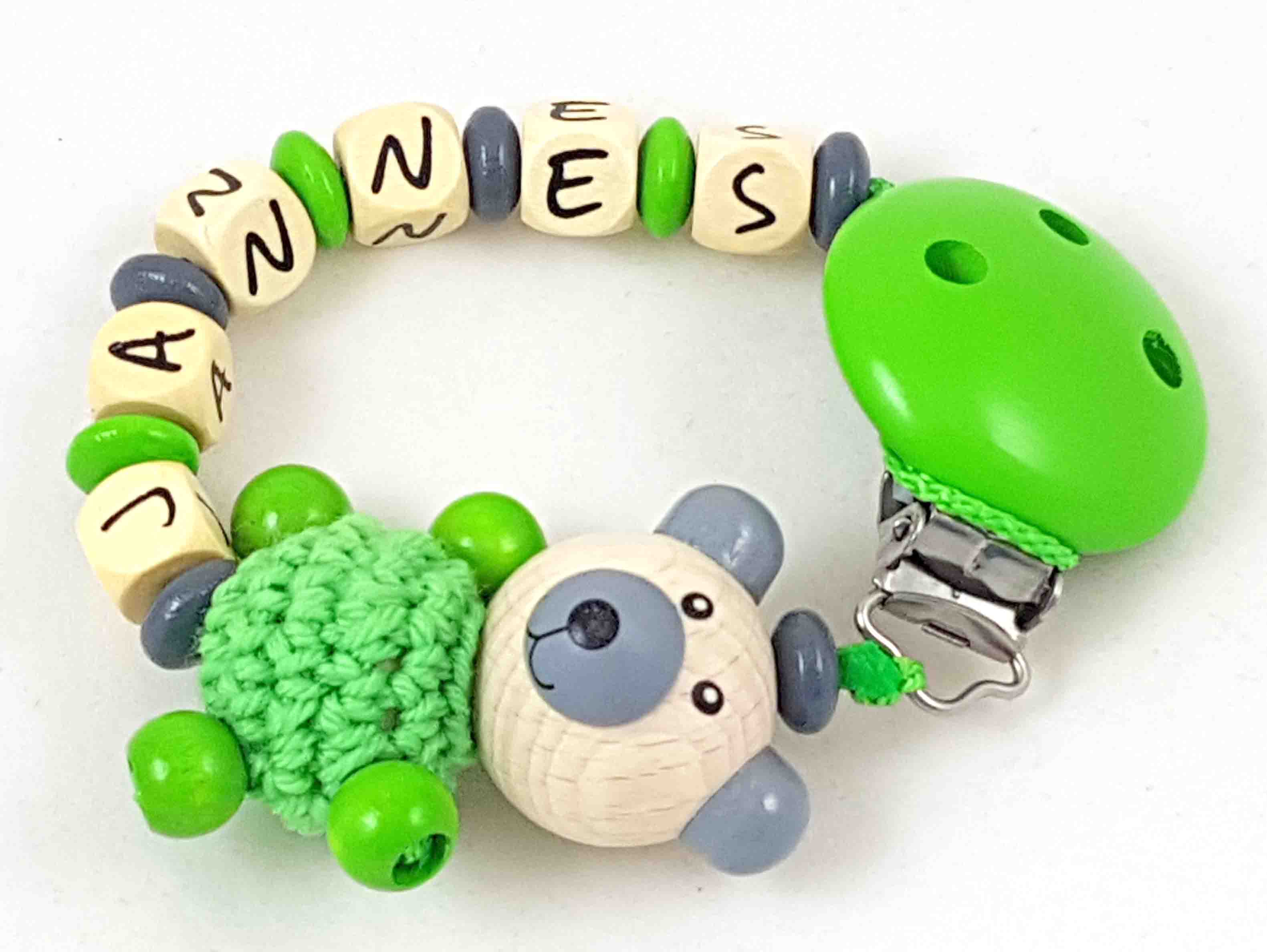 Dieses Modell wird in der Farbkombi apfelgrün/grau, einer Motivperle Bär&Häkelkörper und einem unifarbenen Befestigungsclip gefertigt.
