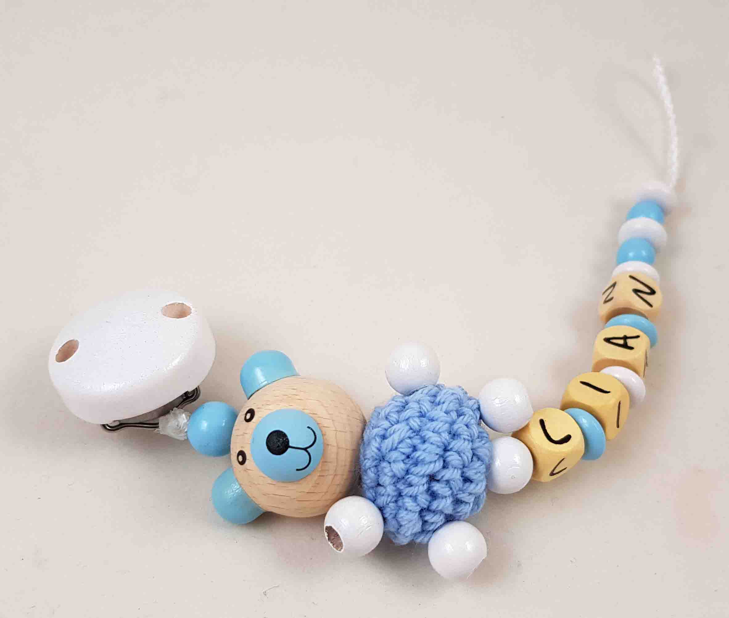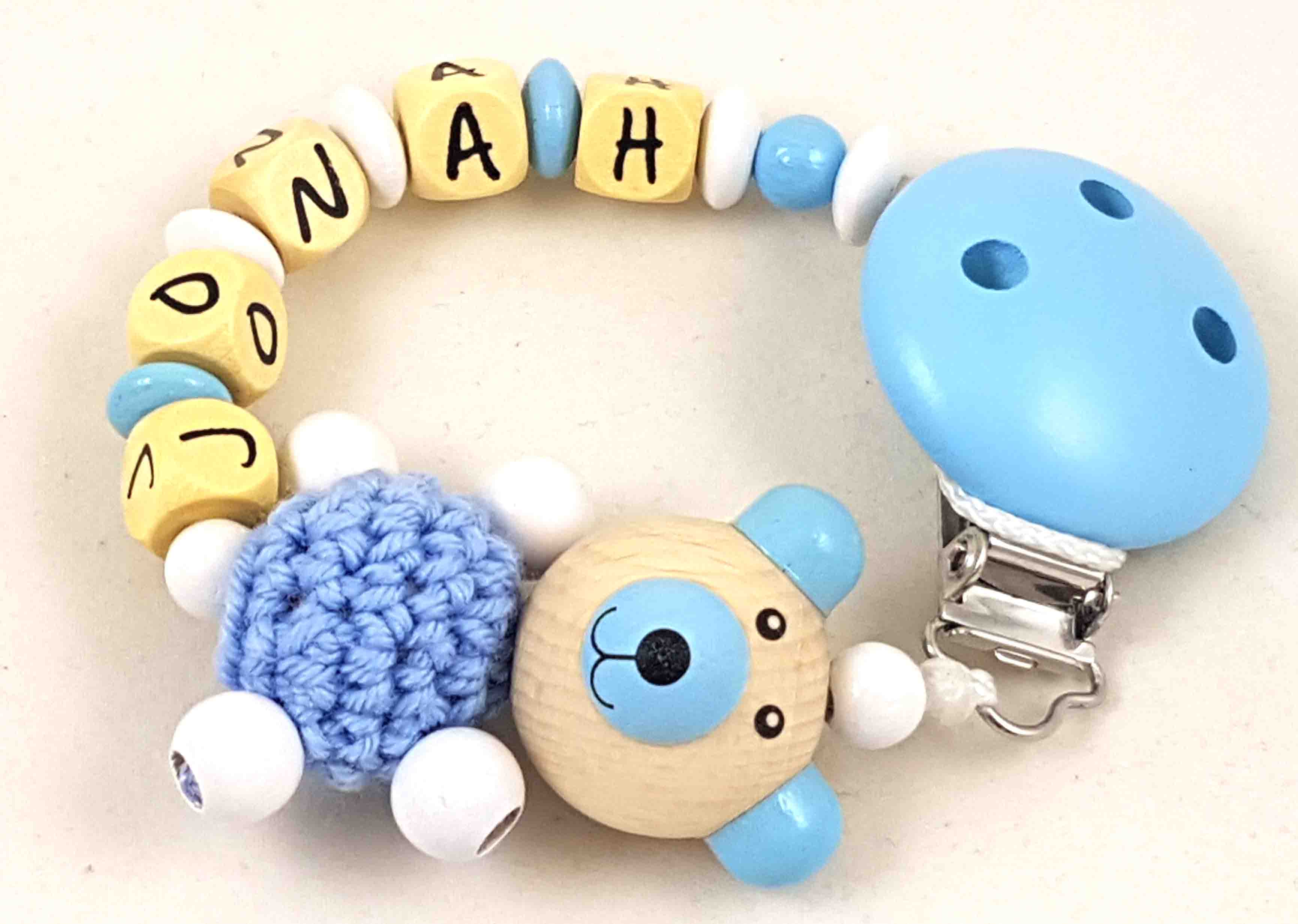 Dieses Modell wird in der Farbkombi babyblau/weiß, einer Motivperle Bär&Häkelkörper und einem unifarbenen Befestigungsclip gefertigt.