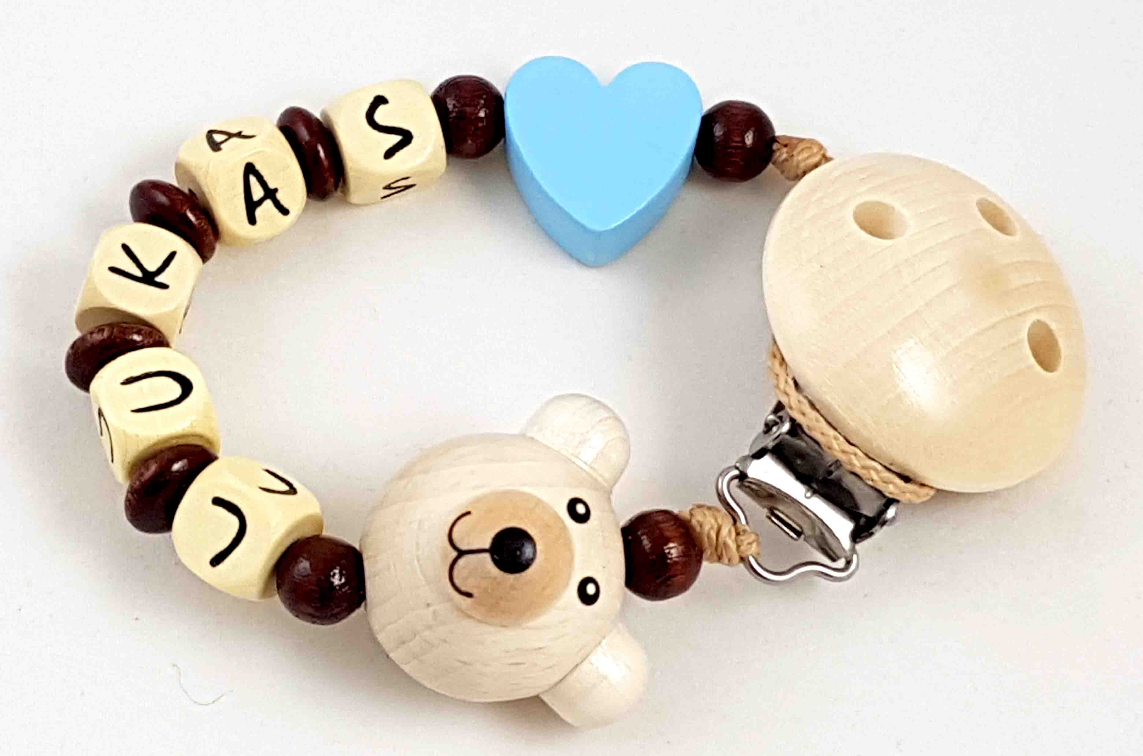 Dieses Modell wird in der Farbkombi braun/natur, einer Motivperle 3D Bär, einer Motivperle Herz und einem unifarbenen Befestigungsclip gefertigt.
