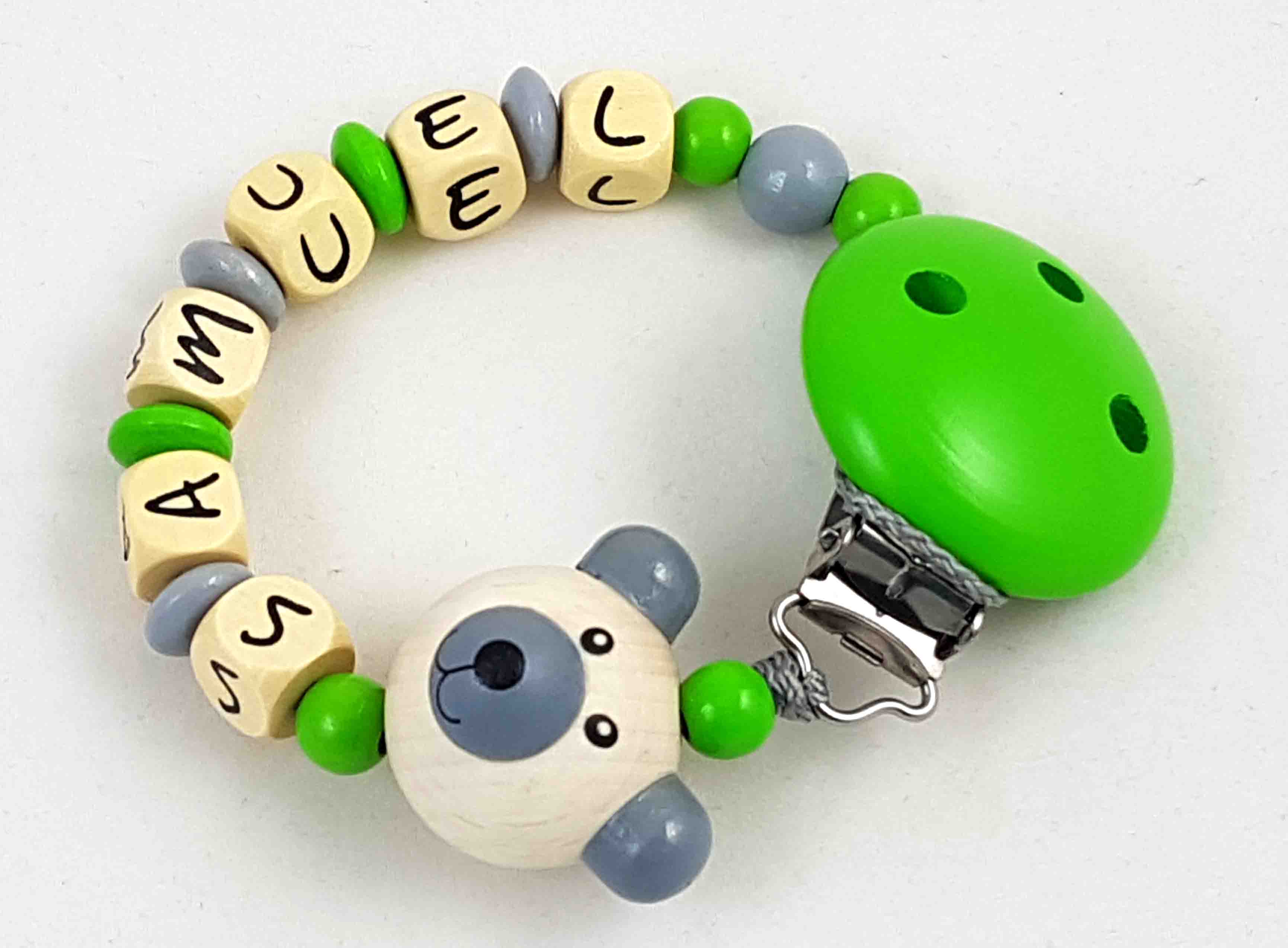 Dieses Schnullerketten-Modell wird in der Farbkombi apfelgrün/grau, einer Motivperle 3D Bär grau und einem unifarbenen Befestigungsclip gefertigt.