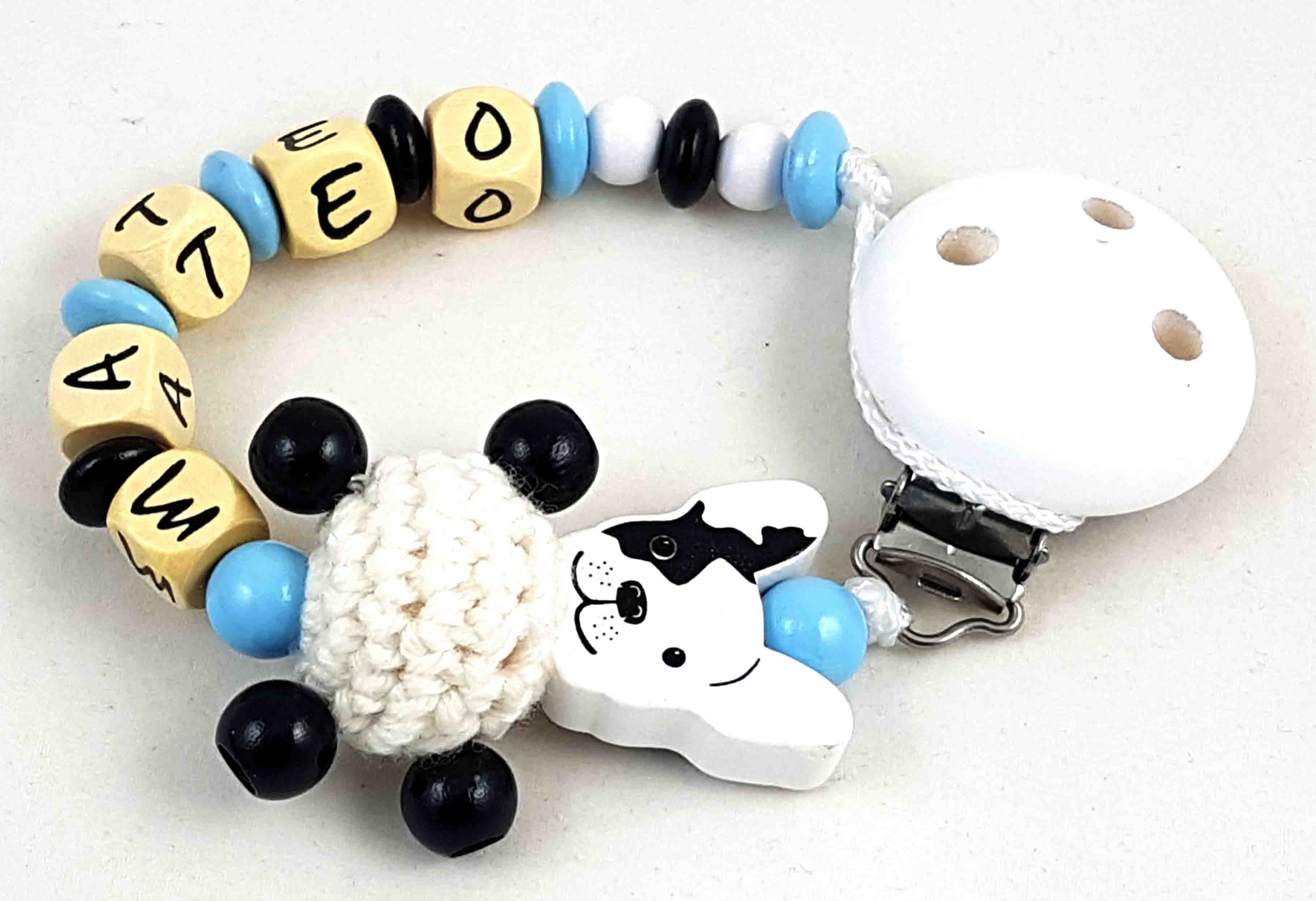 Schnullerkette mit Name "Bulldogge&Häkelkörper" in babyblau/schwarz/weiß