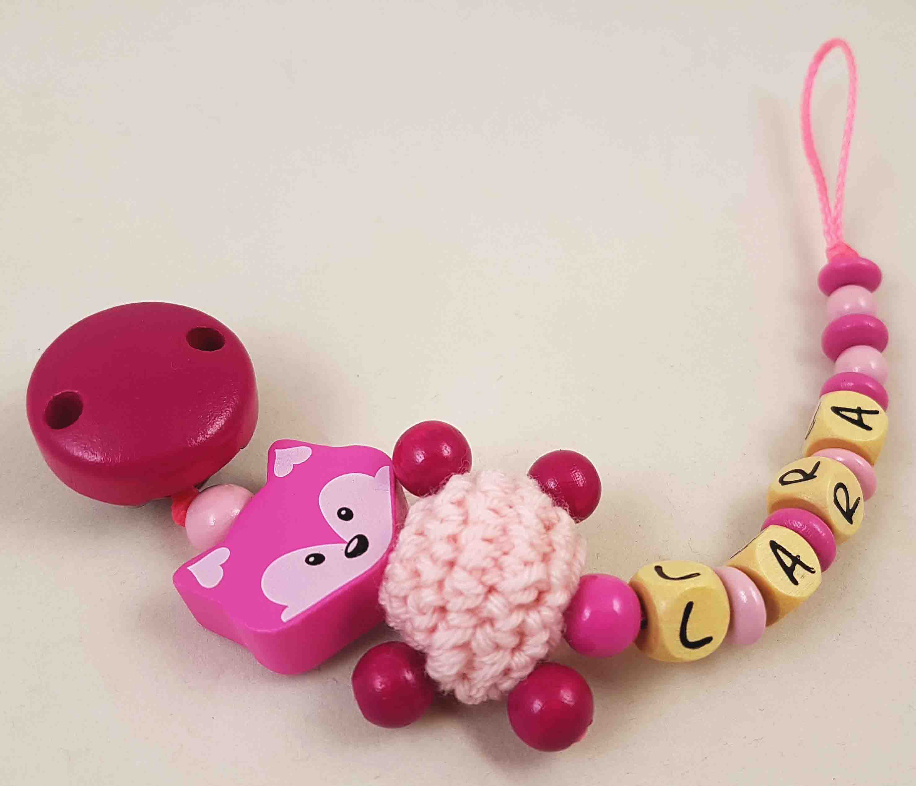 Schnullerkette mit Namen "Fuchs mit Häkelkörper" in babyrosa/pink