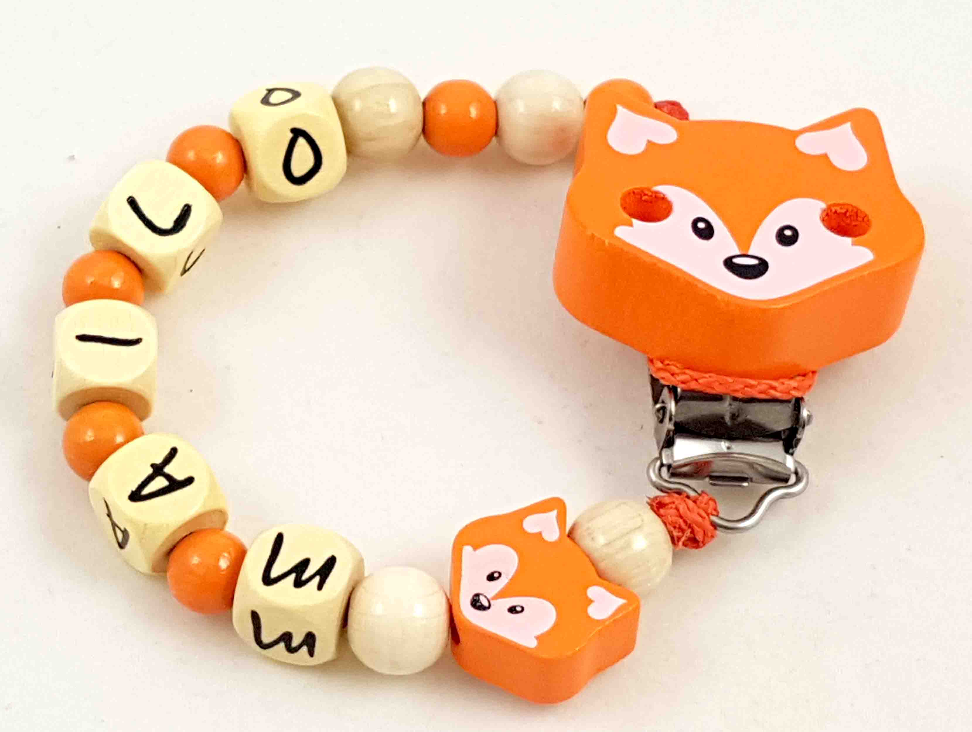 Dieses Modell wird in der Farbkombi natur/orange, einer Motivperle Fuchs und einem unifarbenen Befestigungsclip gefertigt.