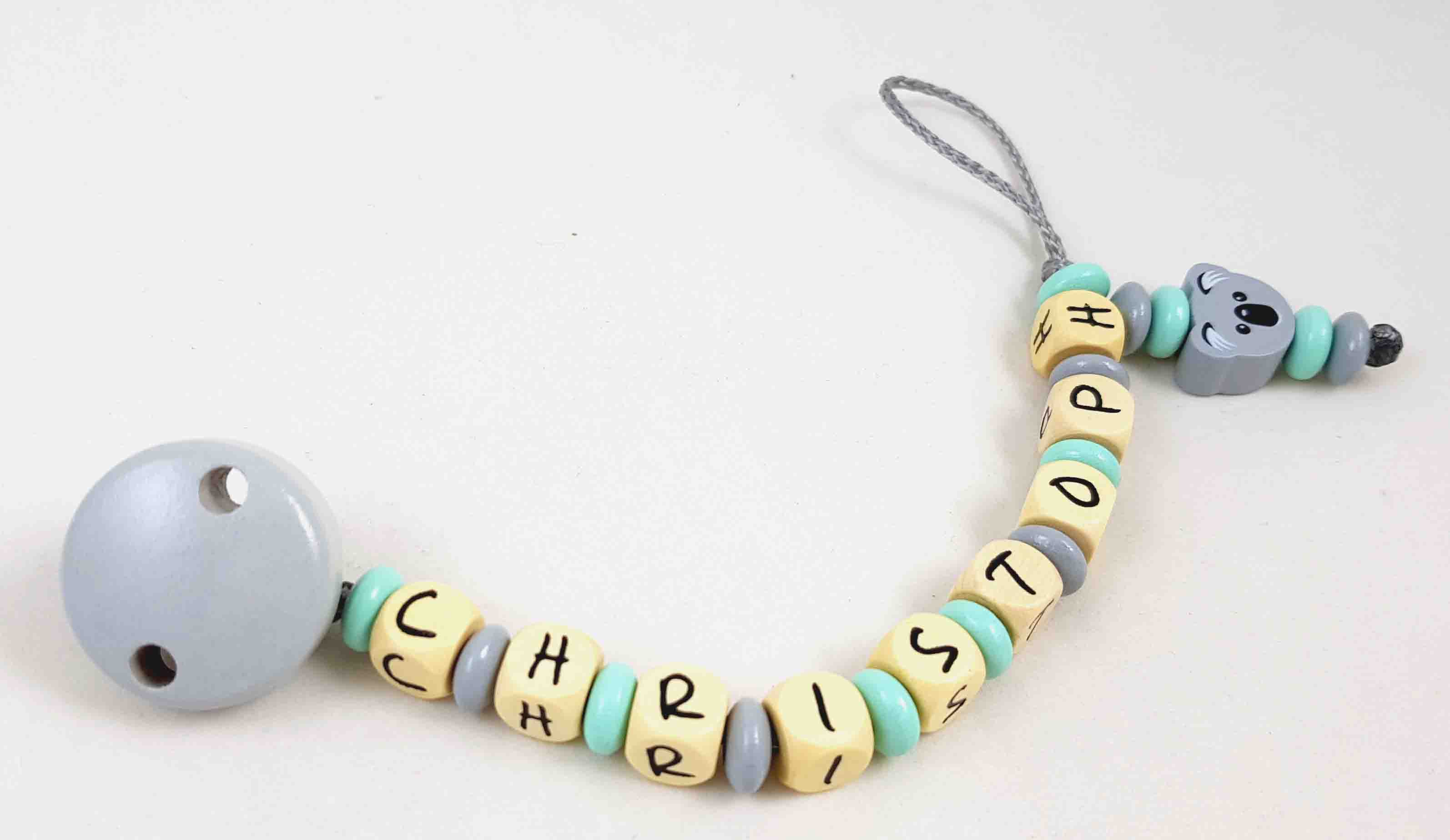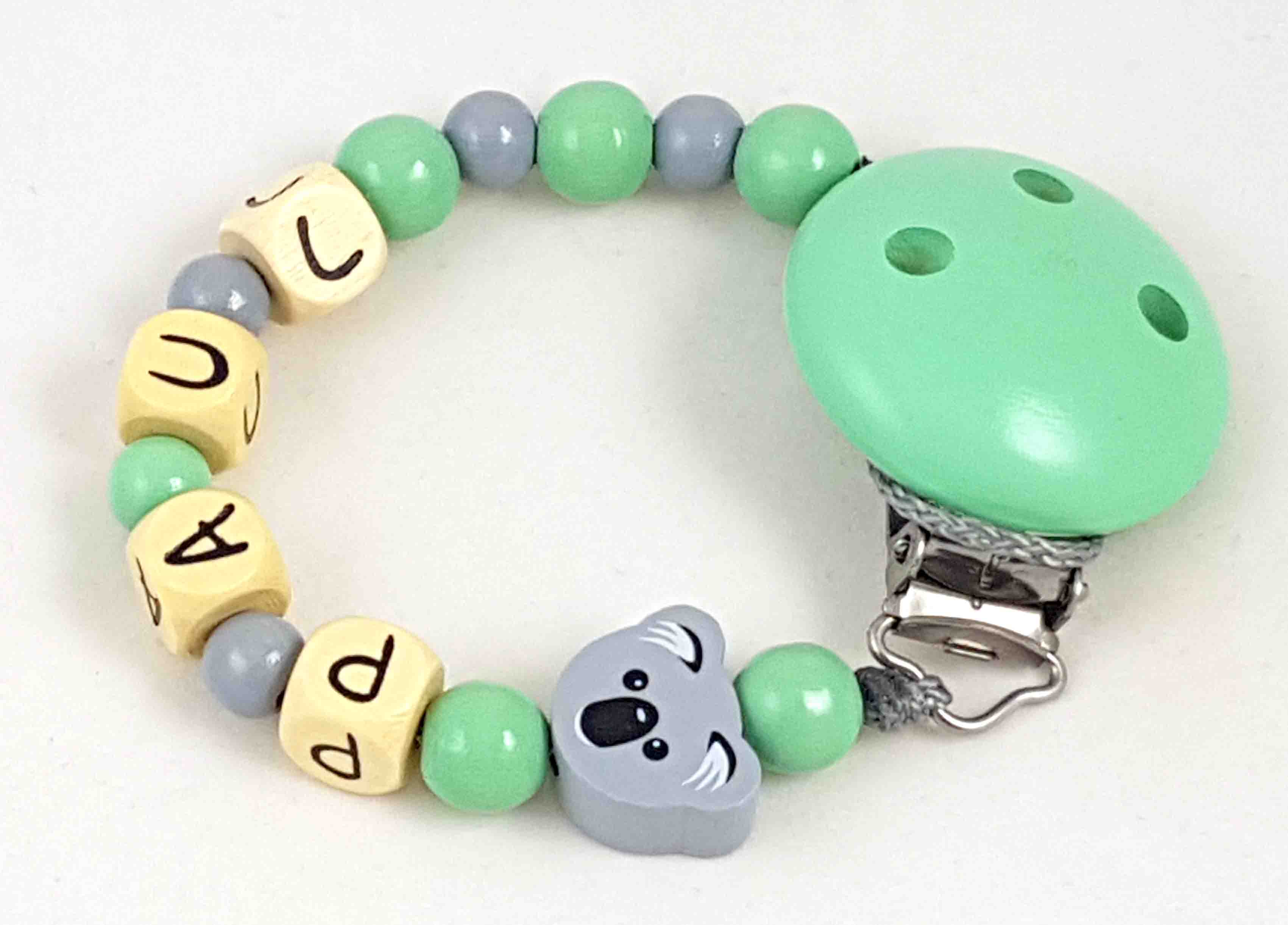 Schnullerkette mit Name "Koala" in grau/pastellgrün