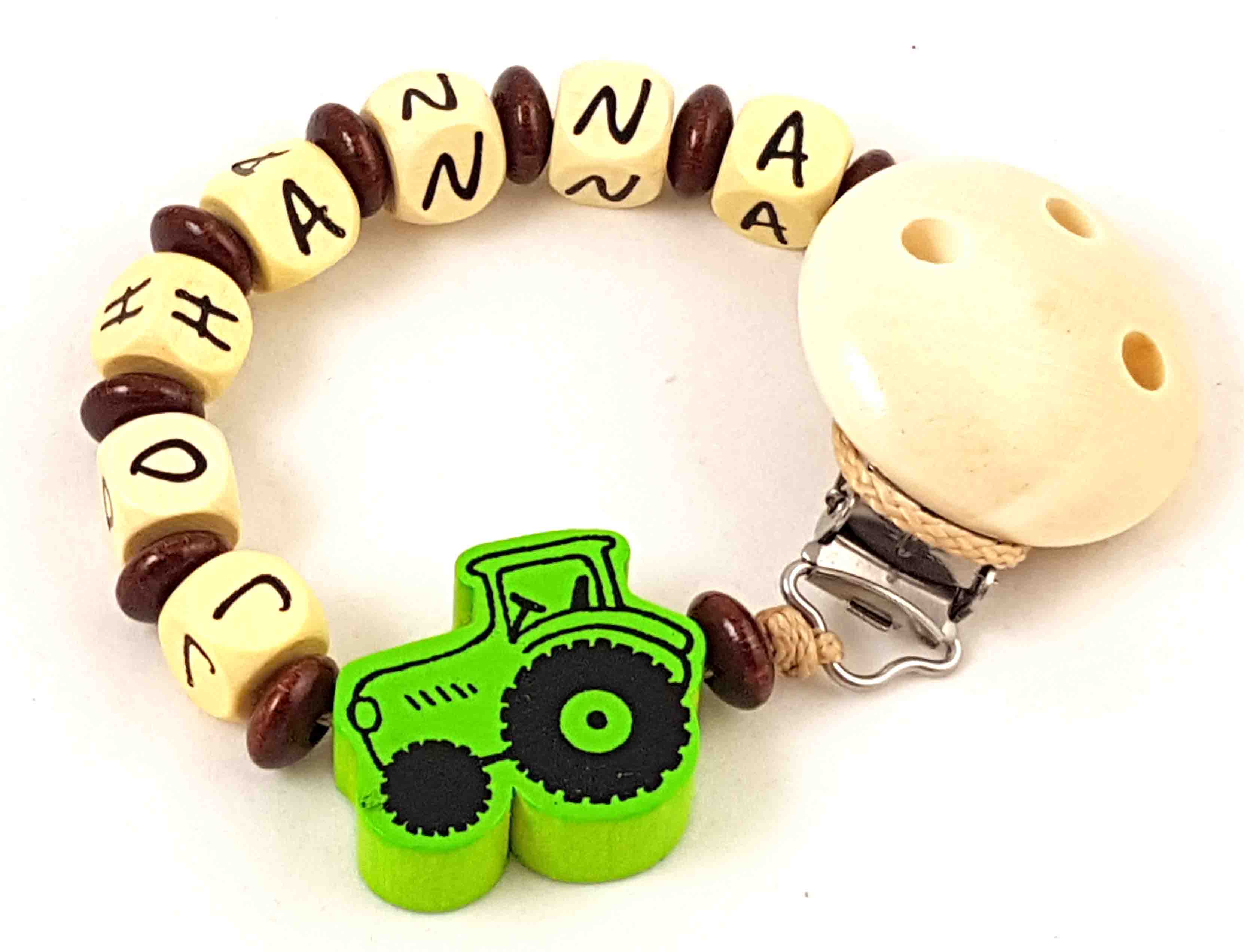 Dieses Schnullerketten-Modell wird in der Farbkombi braun/natur, einer Motivperle Traktor und einem unifarbenen Befestigungsclip gefertigt.