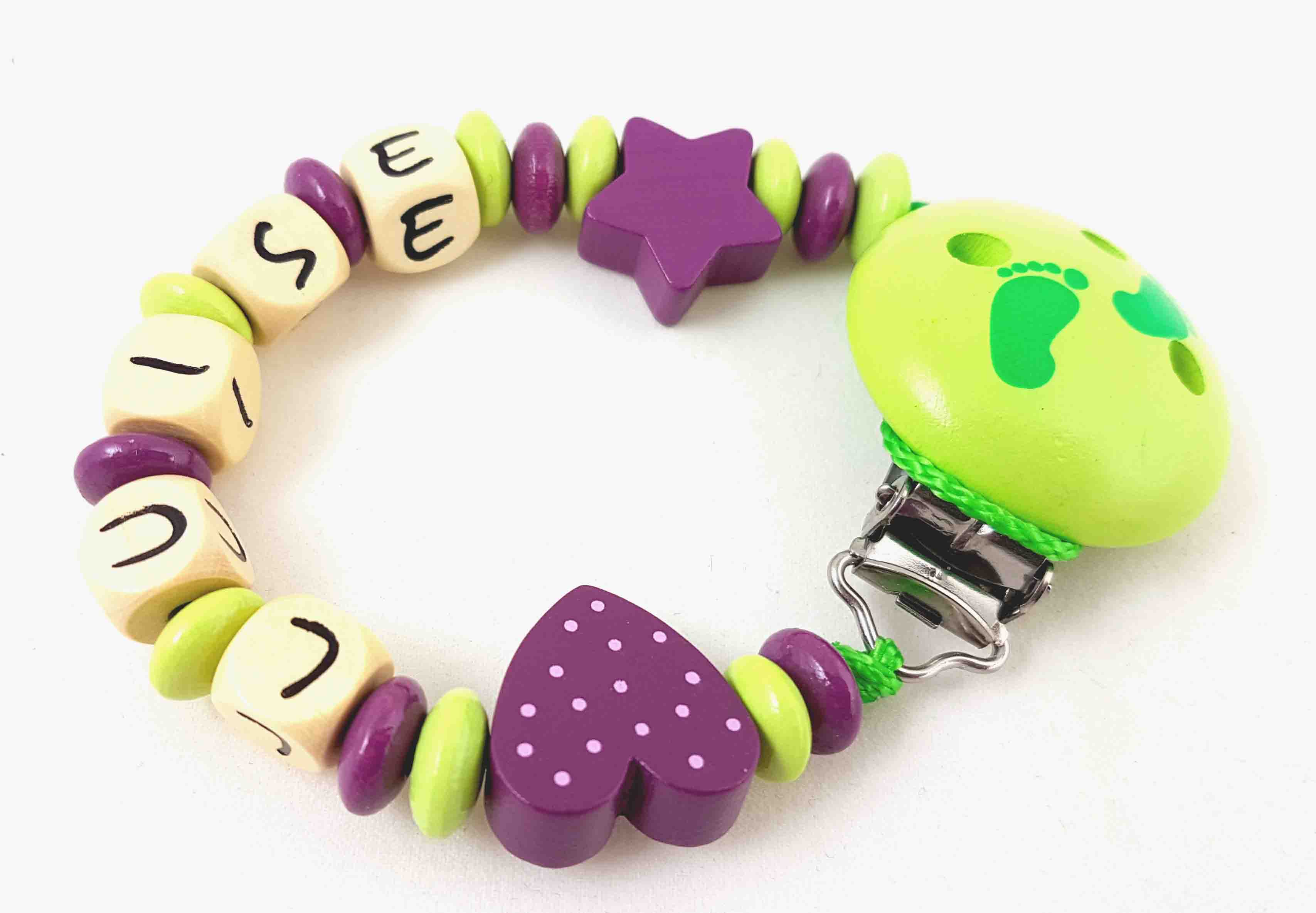 Schnullerkette mit Name "Tupfenherz&Stern" in lemon/pflaume