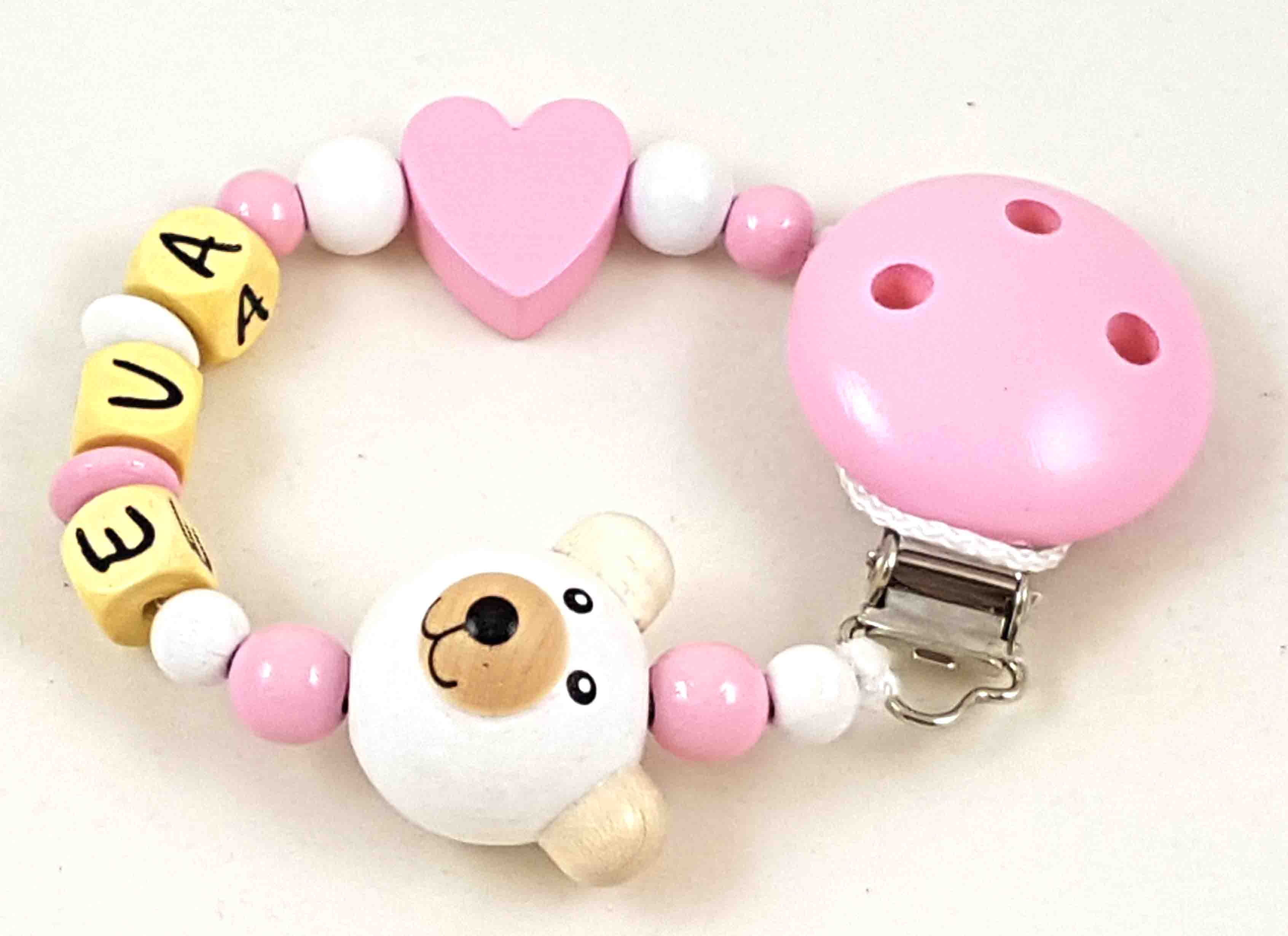 Dieses Modell wird in der Farbkombi babyrosa/weiß, einer Motivperle 3D Bär, einer Motivperle Herz und einem unifarbenen Befestigungsclip gefertigt.