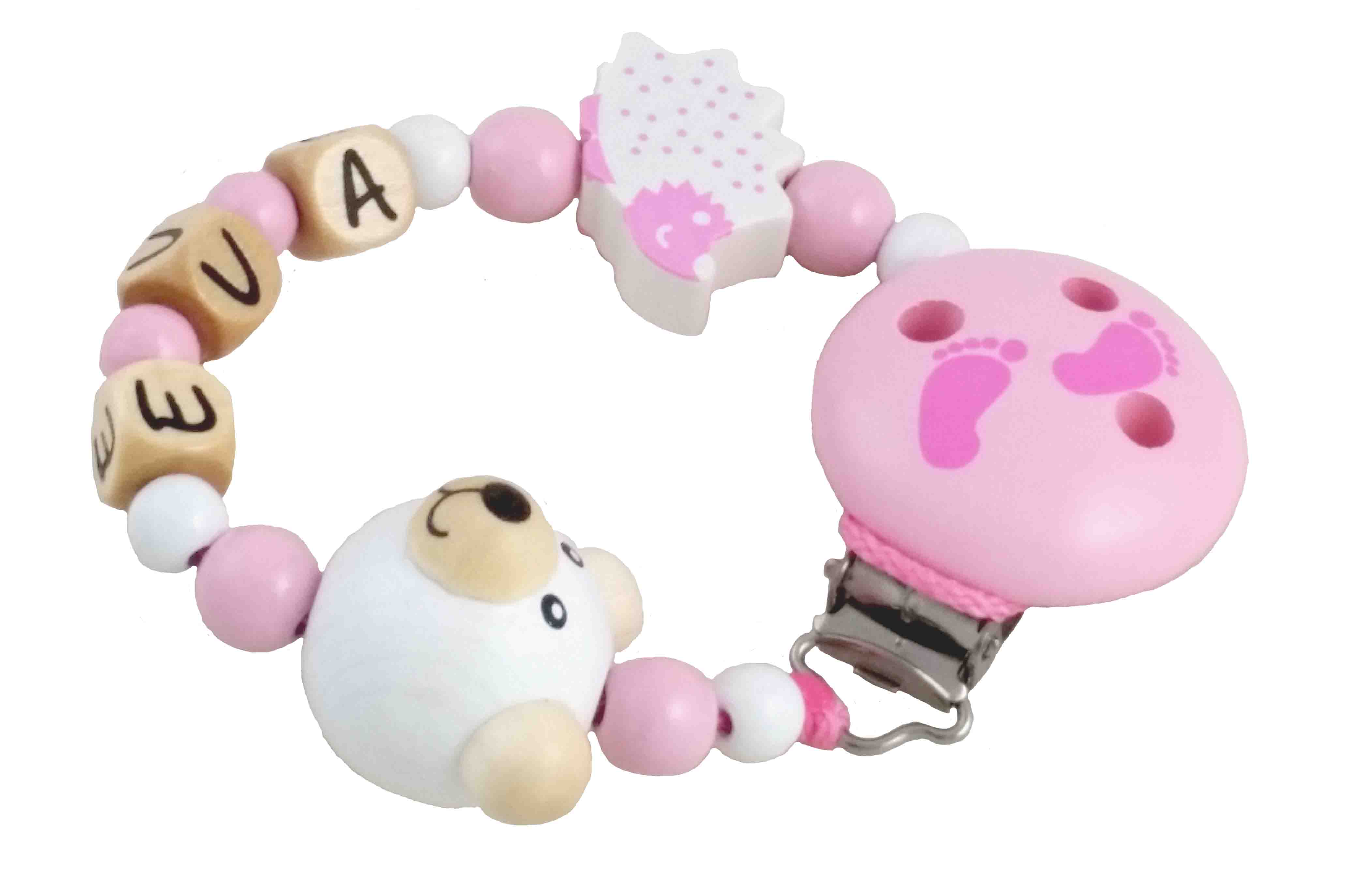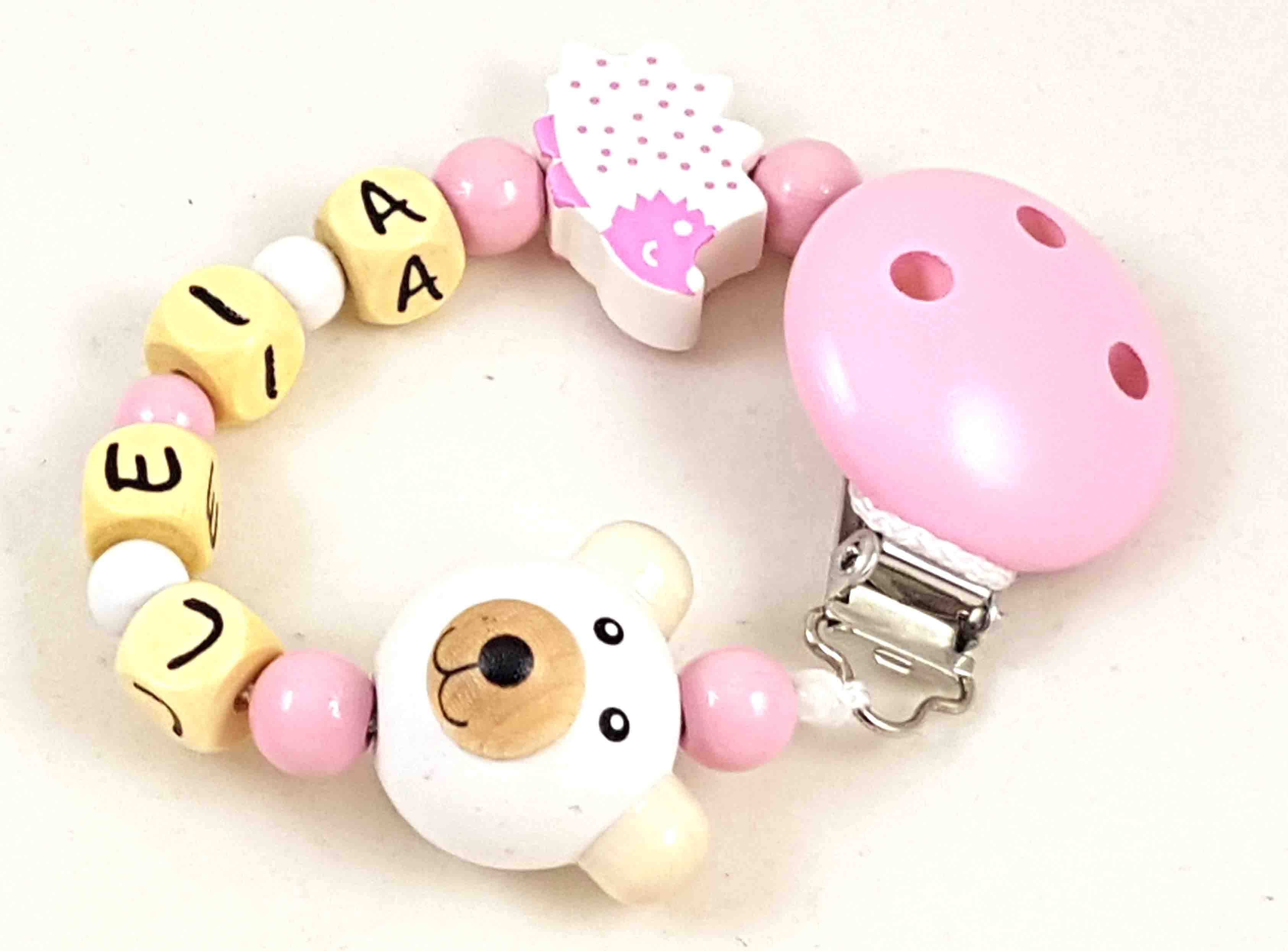 Dieses Modell wird in der Farbkombi babyrosa/weiß, einer Motivperle 3D Bär, einer Motivperle Igel und einem unifarbenen Befestigungsclip gefertigt.