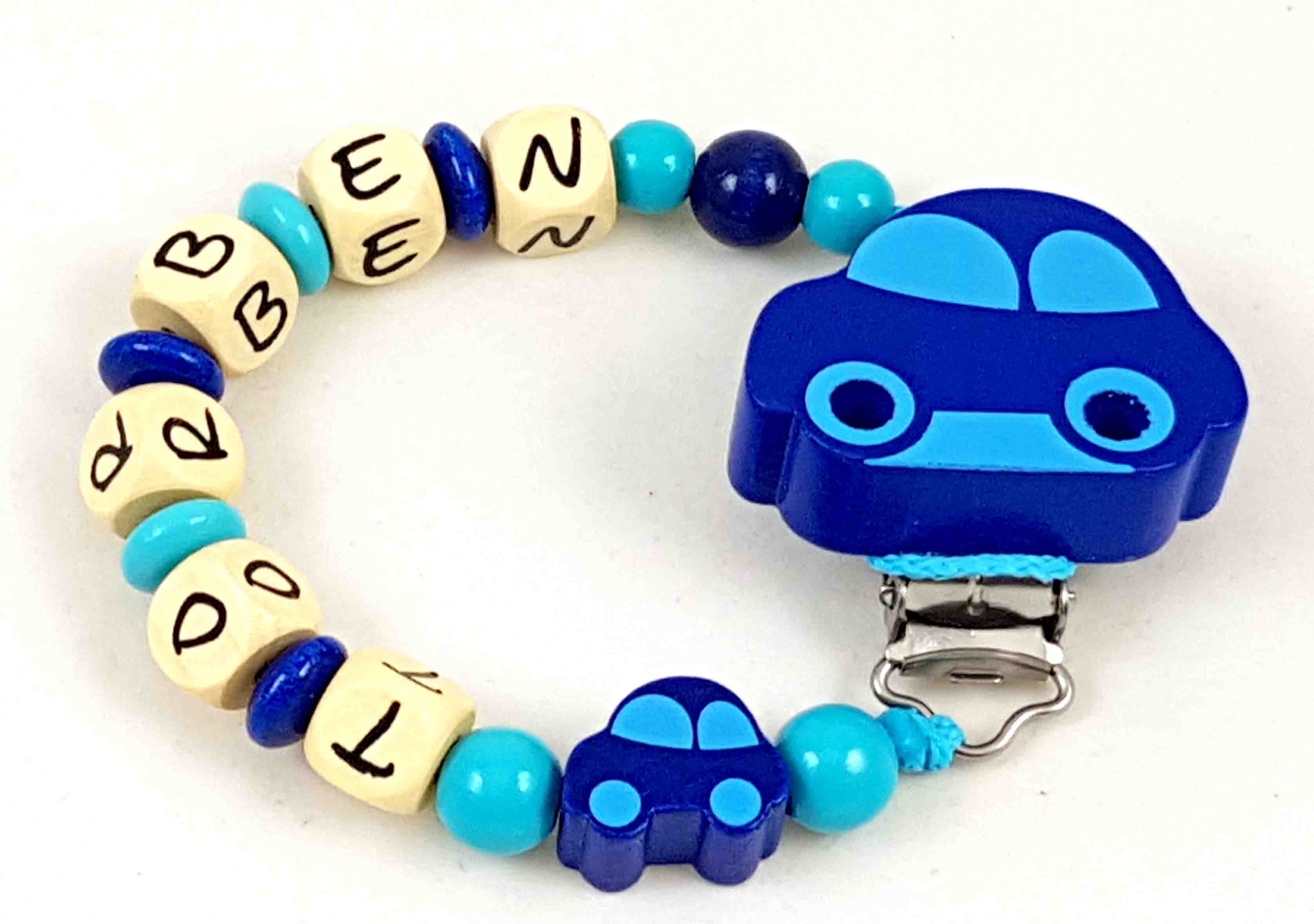 Schnullerkette mit Name "Auto" in dunkelblau/mint