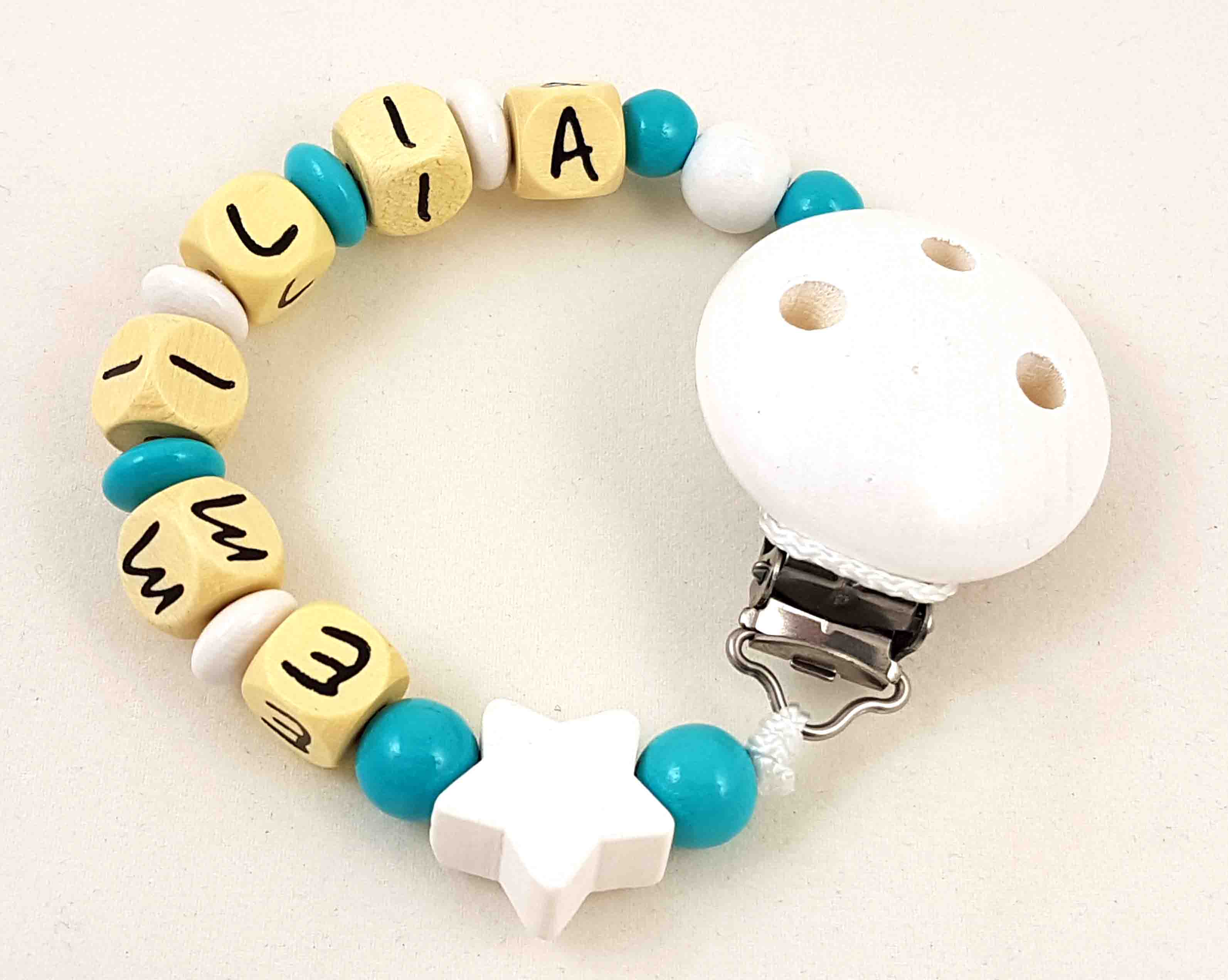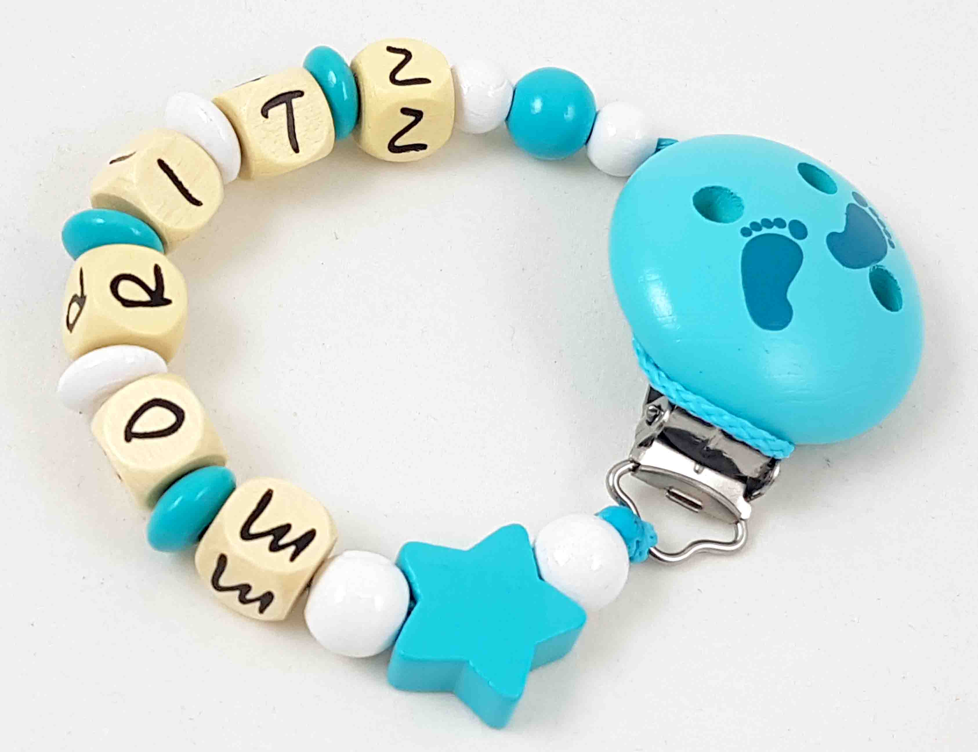 Die abgebildete Schnullerkette besteht aus einer belastbaren PP-Schnur, einem nickelfreien Befestigungsclip aus Holz, geprägten Holzbuchstabenwürfel und Holzperlen bzw. Holzlinsen sowie einer Motivperle aus Holz.