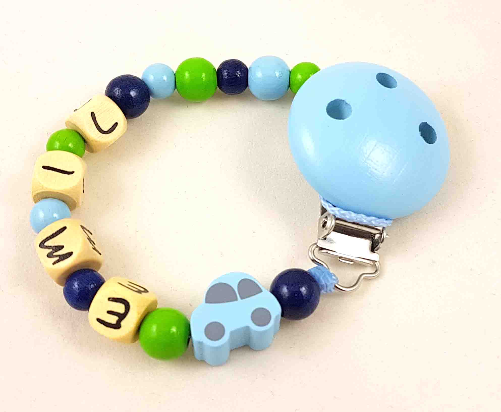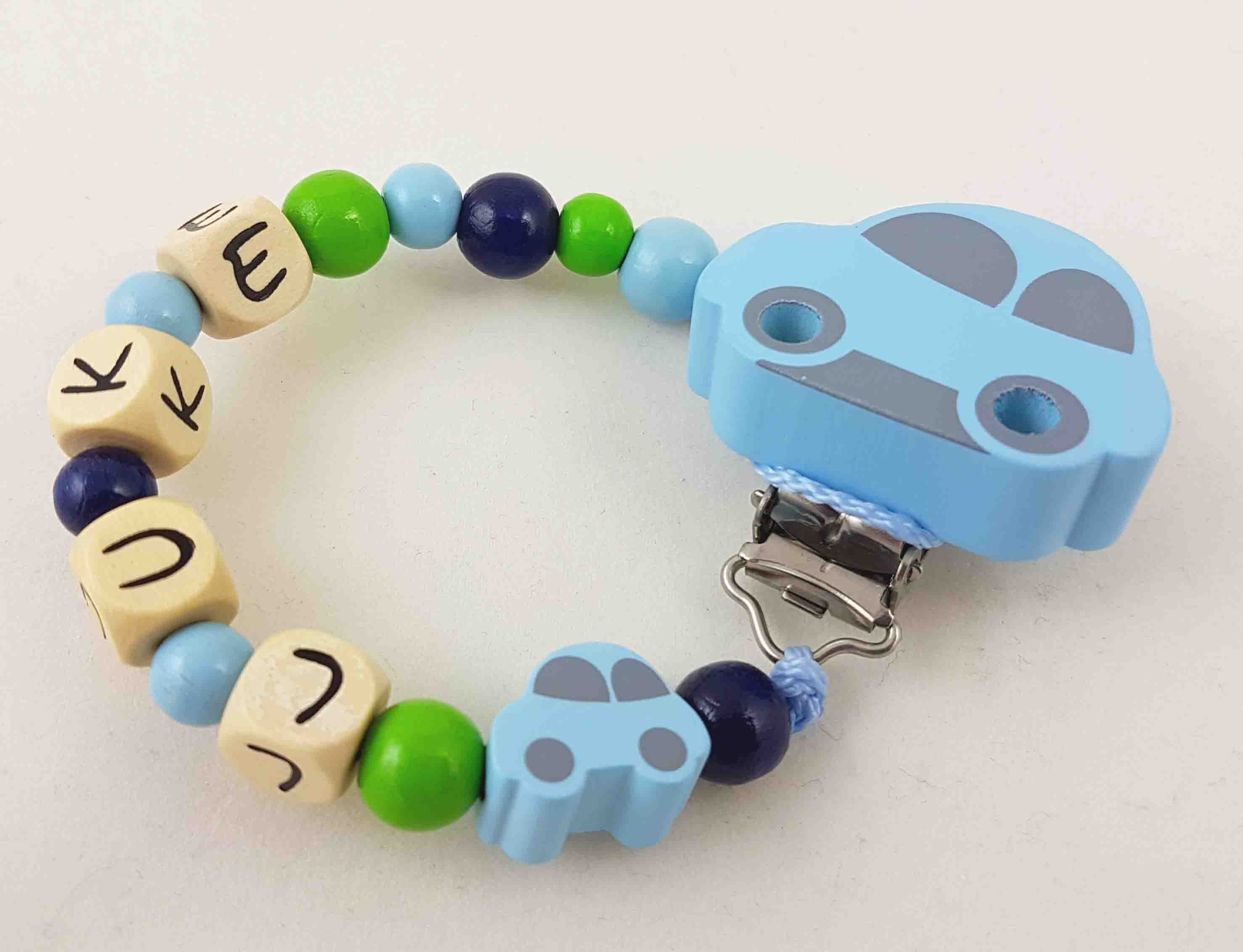 Dieses Schnullerkette-Modell wird in der Farbkombi apfelgrün/babyblau/dunkelblau, einer Motivperle Auto und einem unifarbenen Befestigungsclip gefertigt.
