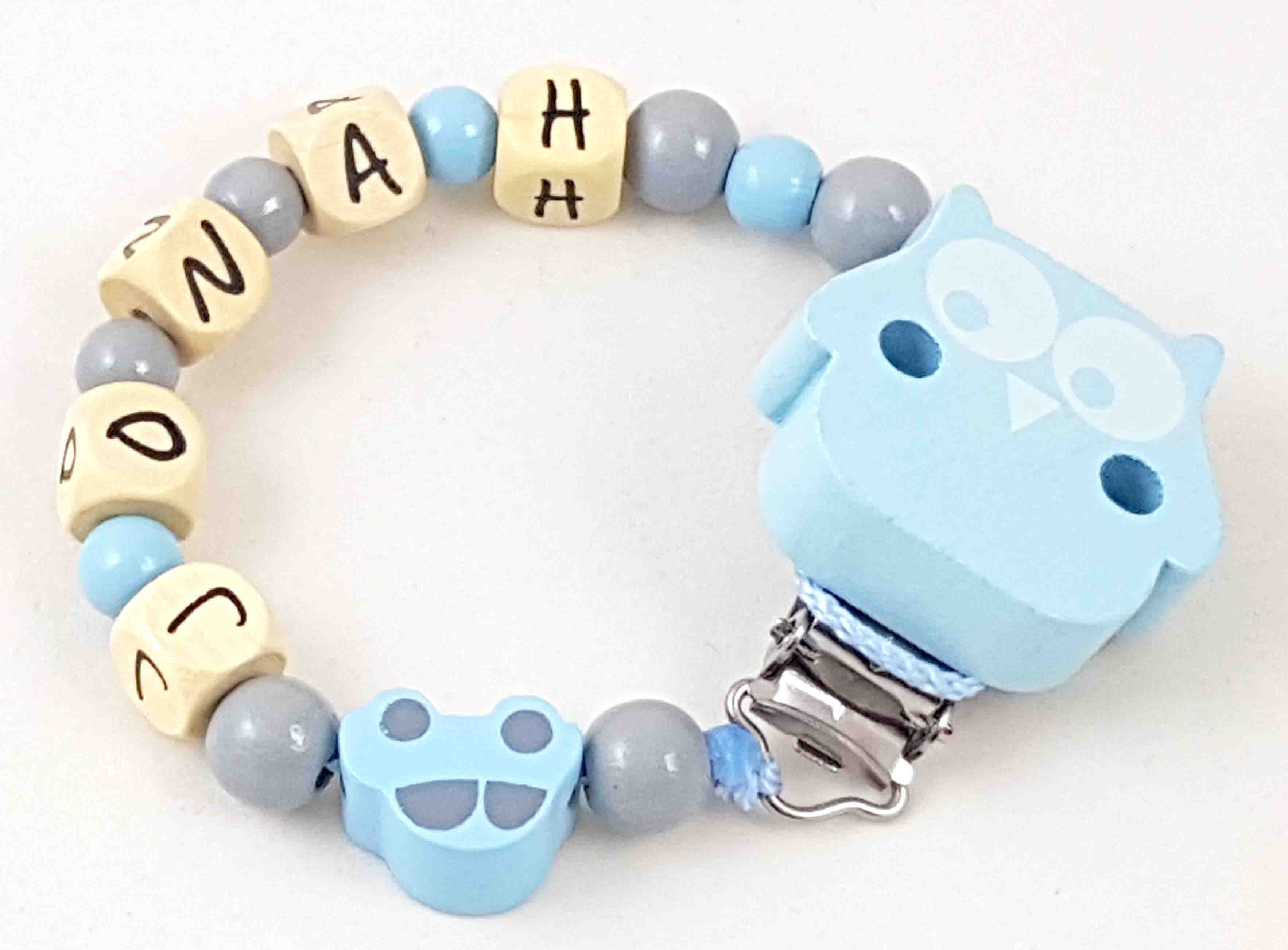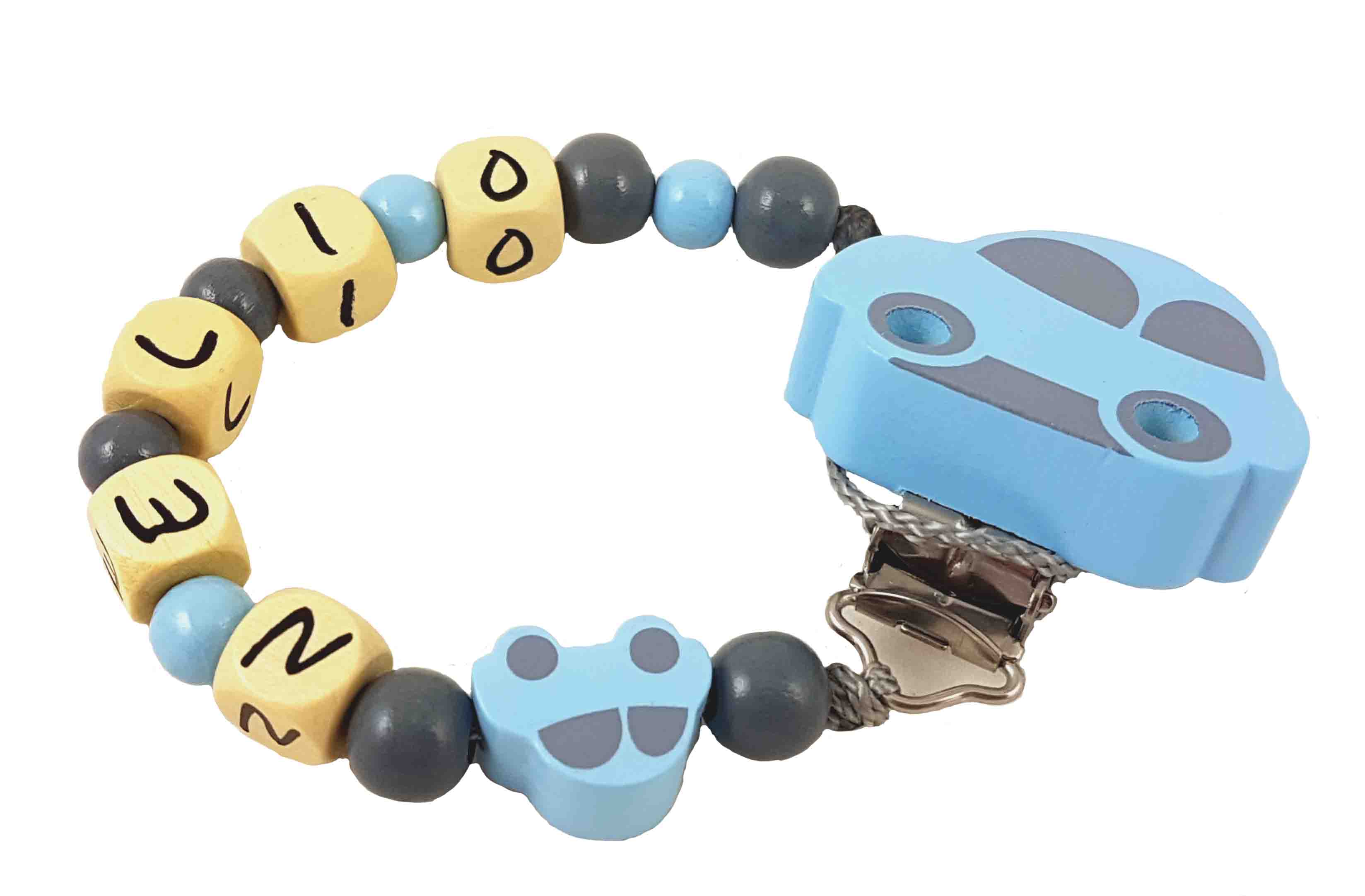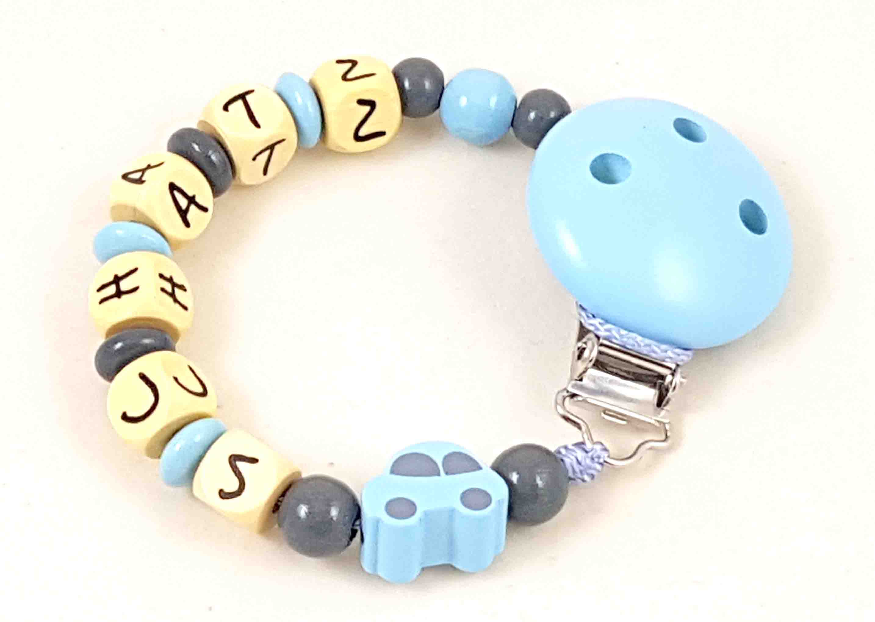 Preview: Schnullerkette mit Name "Auto" babyblau/grau