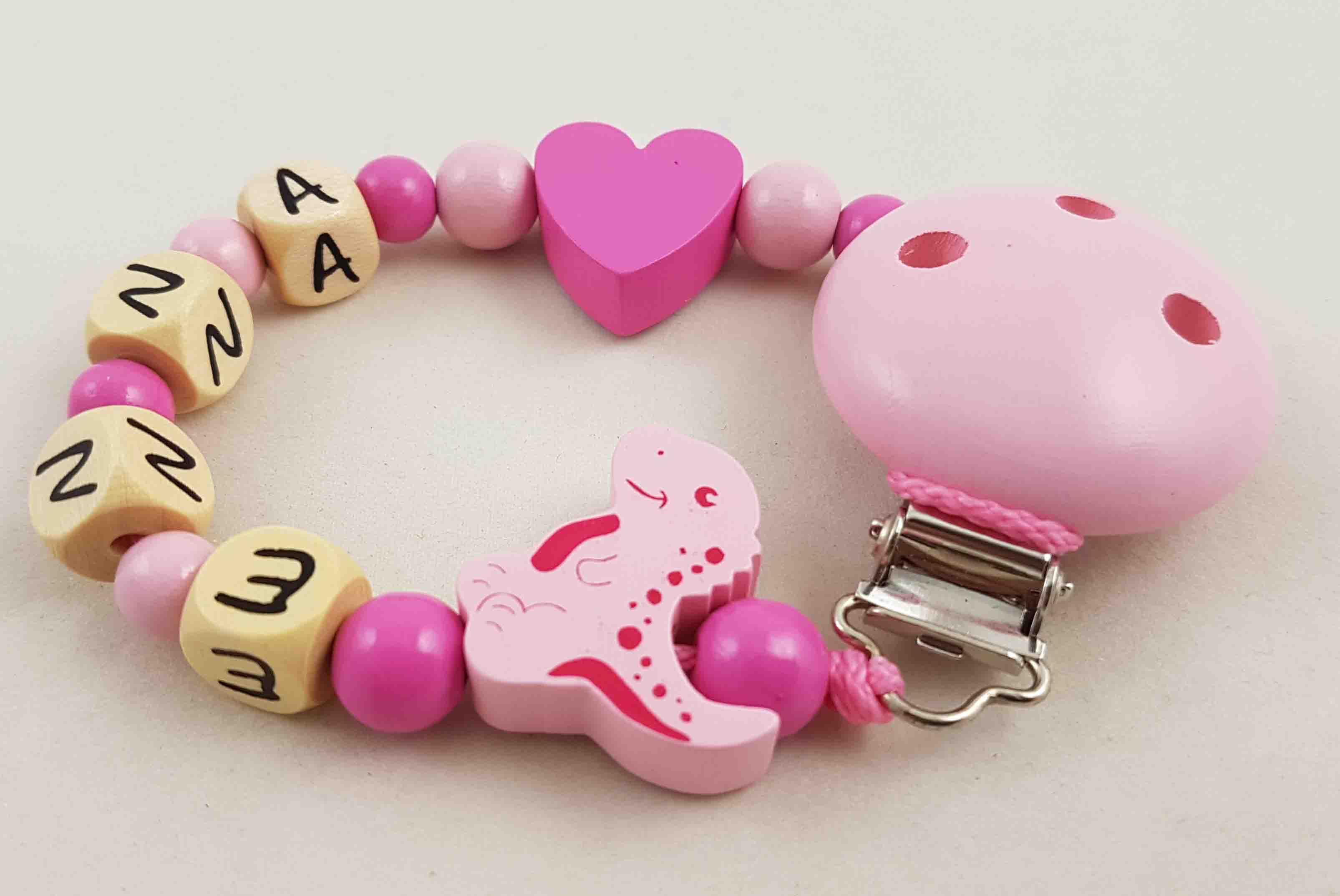 Dieses Modell wird in der Farbkombi babyrosa/pink, einer Motivperle Dino, einer Motivperle Herz und einem unifarbenen Befestigungsclip gefertigt.
