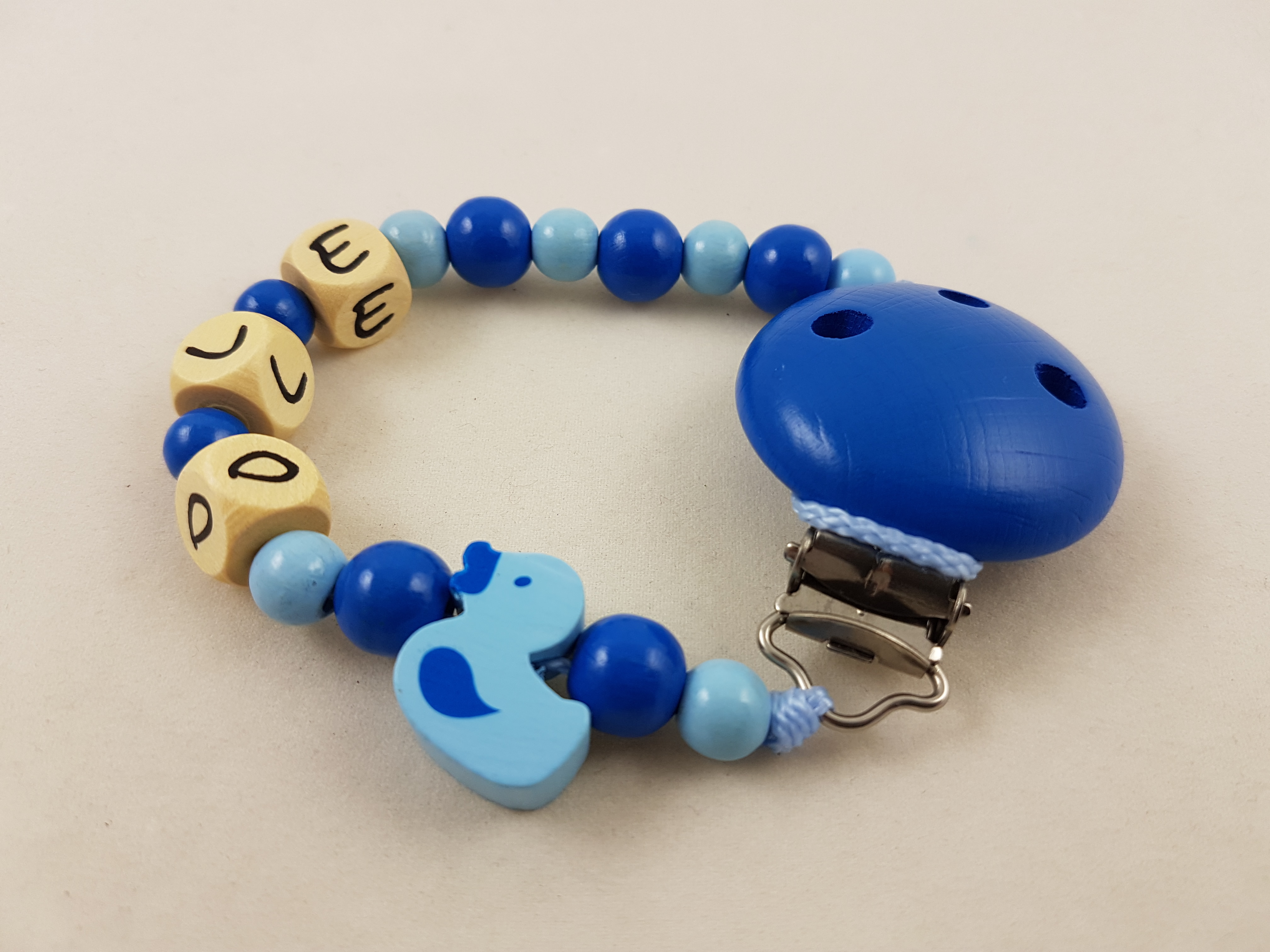 Schnullerkette mit Name "Ente" in babyblau/mittelblau