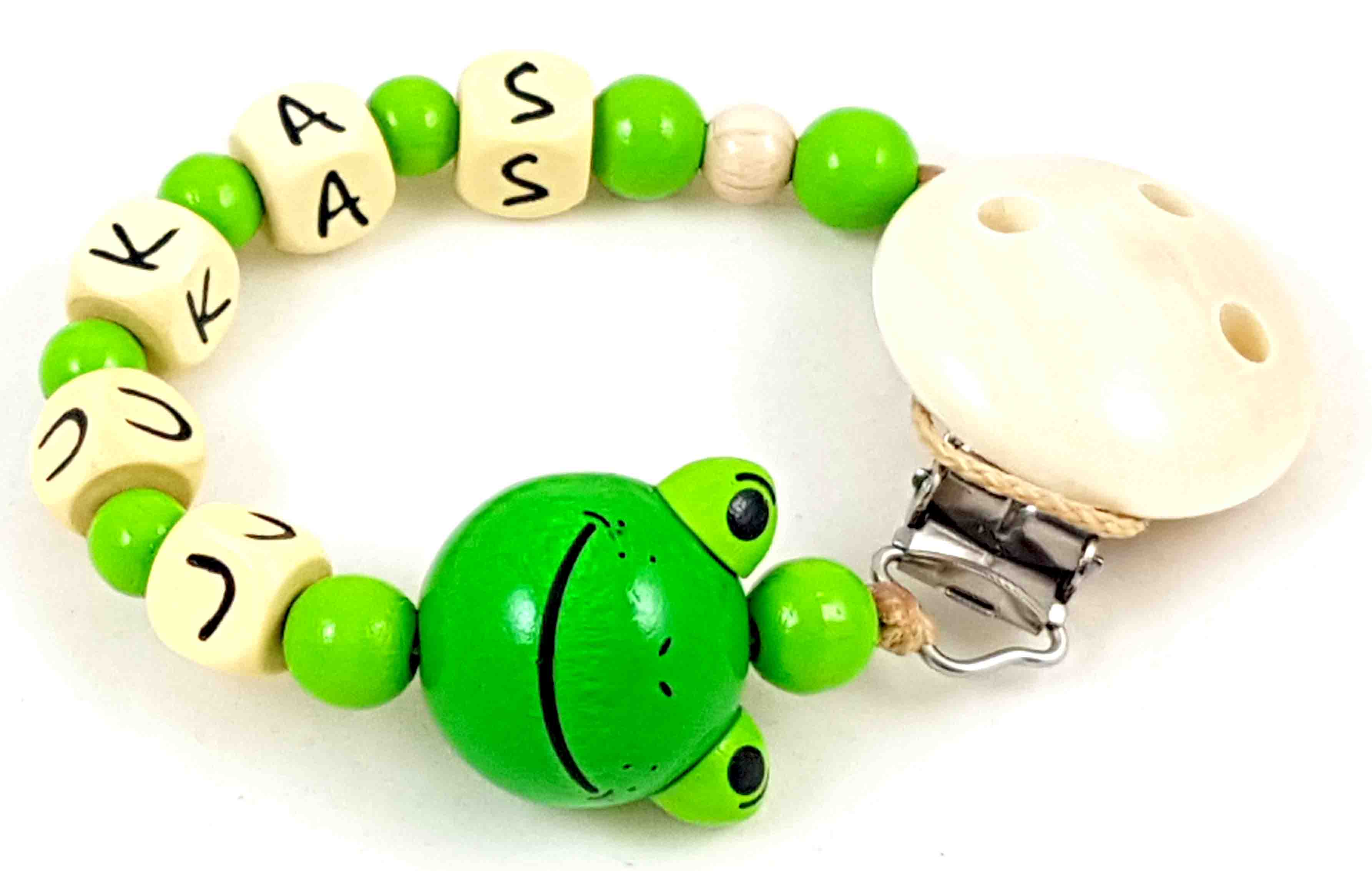 Dieses Modell wird in der Farbkombi apfelgrün/natur, einer Motivperle 3D Frosch und einem unifarbenen Befestigungsclip gefertigt.