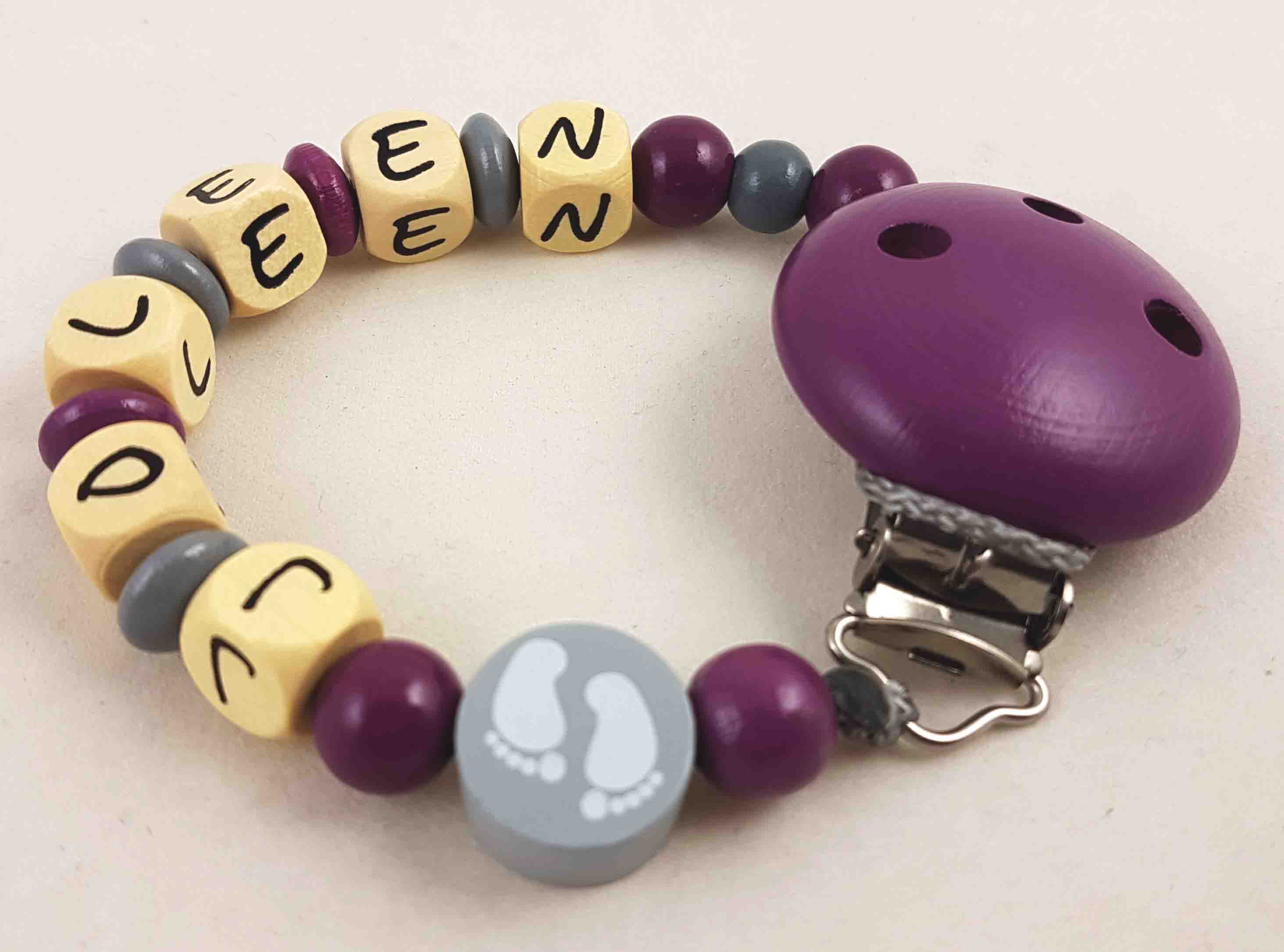 Schnullerkette mit Name "Füßchen" in grau/pflaume