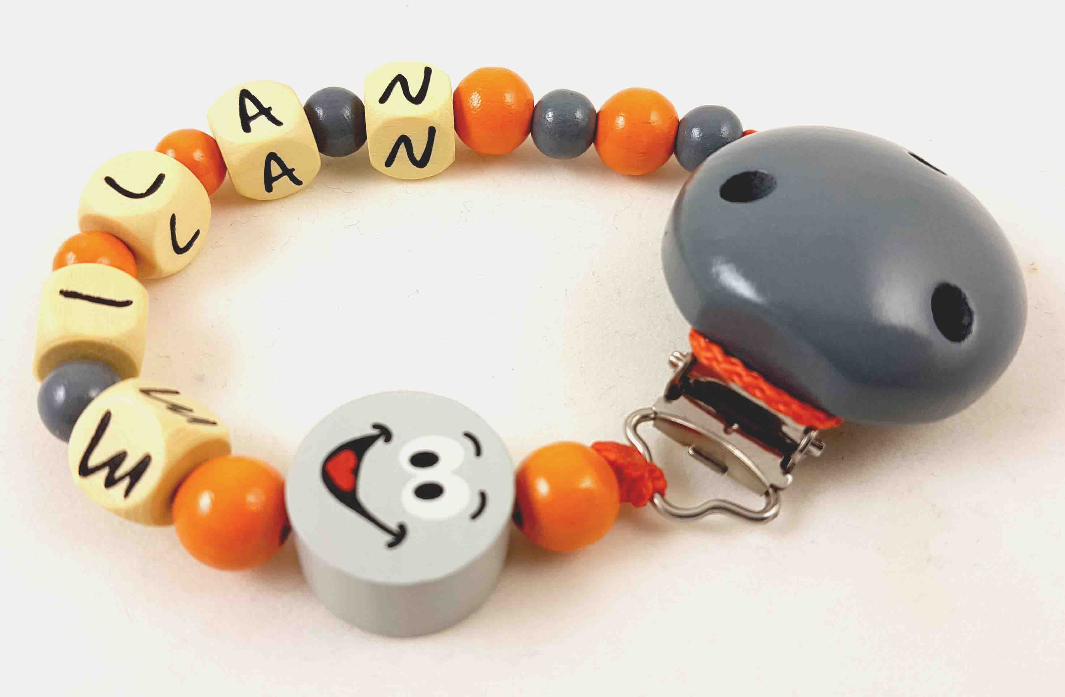 Dieses Schnullerketten-Modell wird in der Farbkombi grau/orange, einer Motivperle Smiley und einem unifarbenen Befestigungsclip gefertigt.
