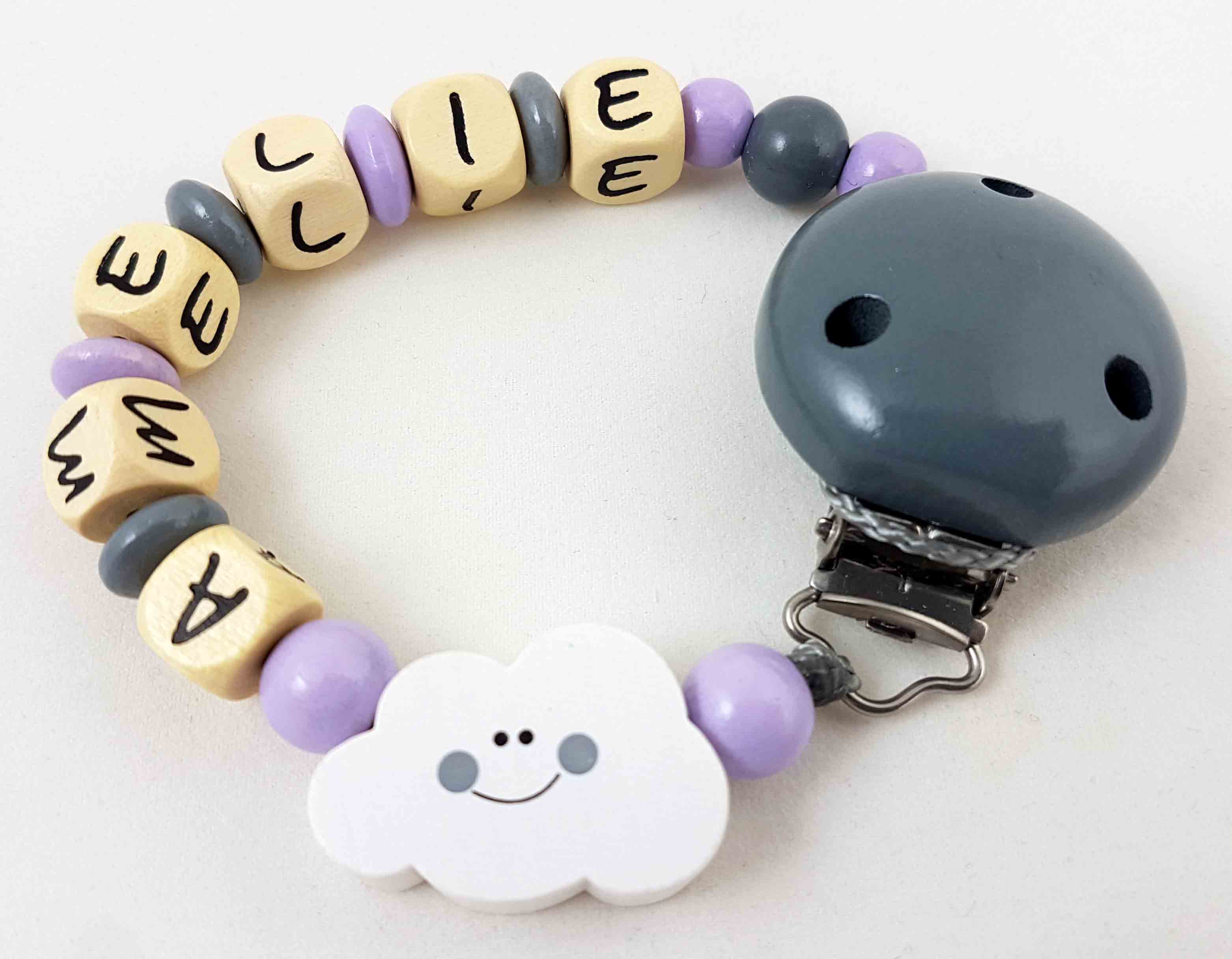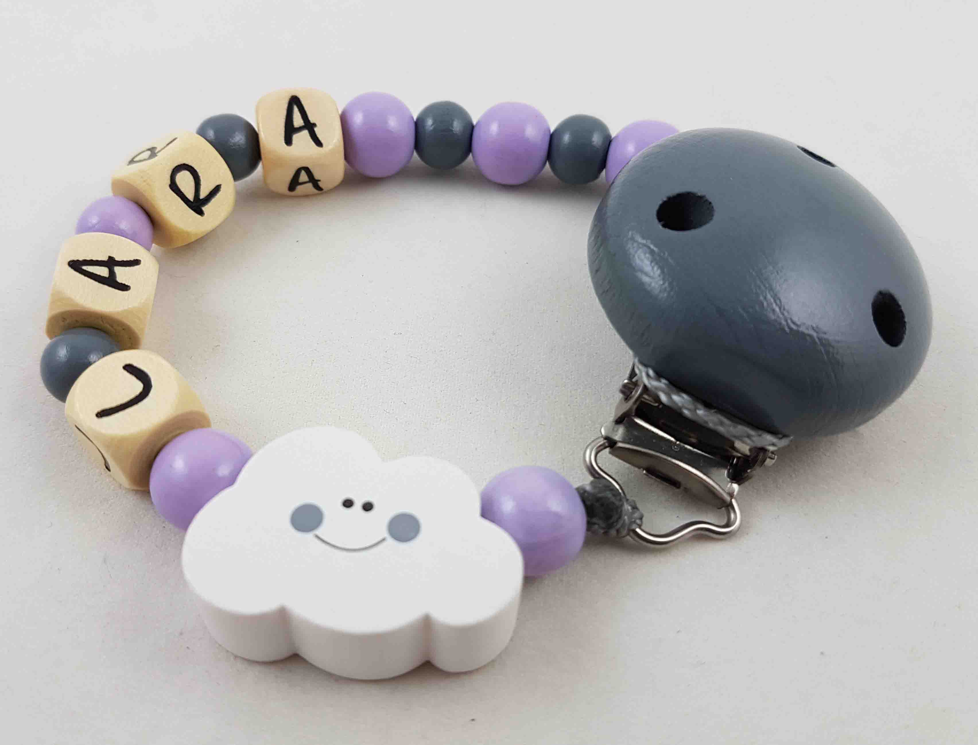 Dieses Schnullerketten-Modell wird in der Farbkombi flieder/grau, einer Motivperle Wolke und einem unifarbenen Befestigungsclip gefertigt.