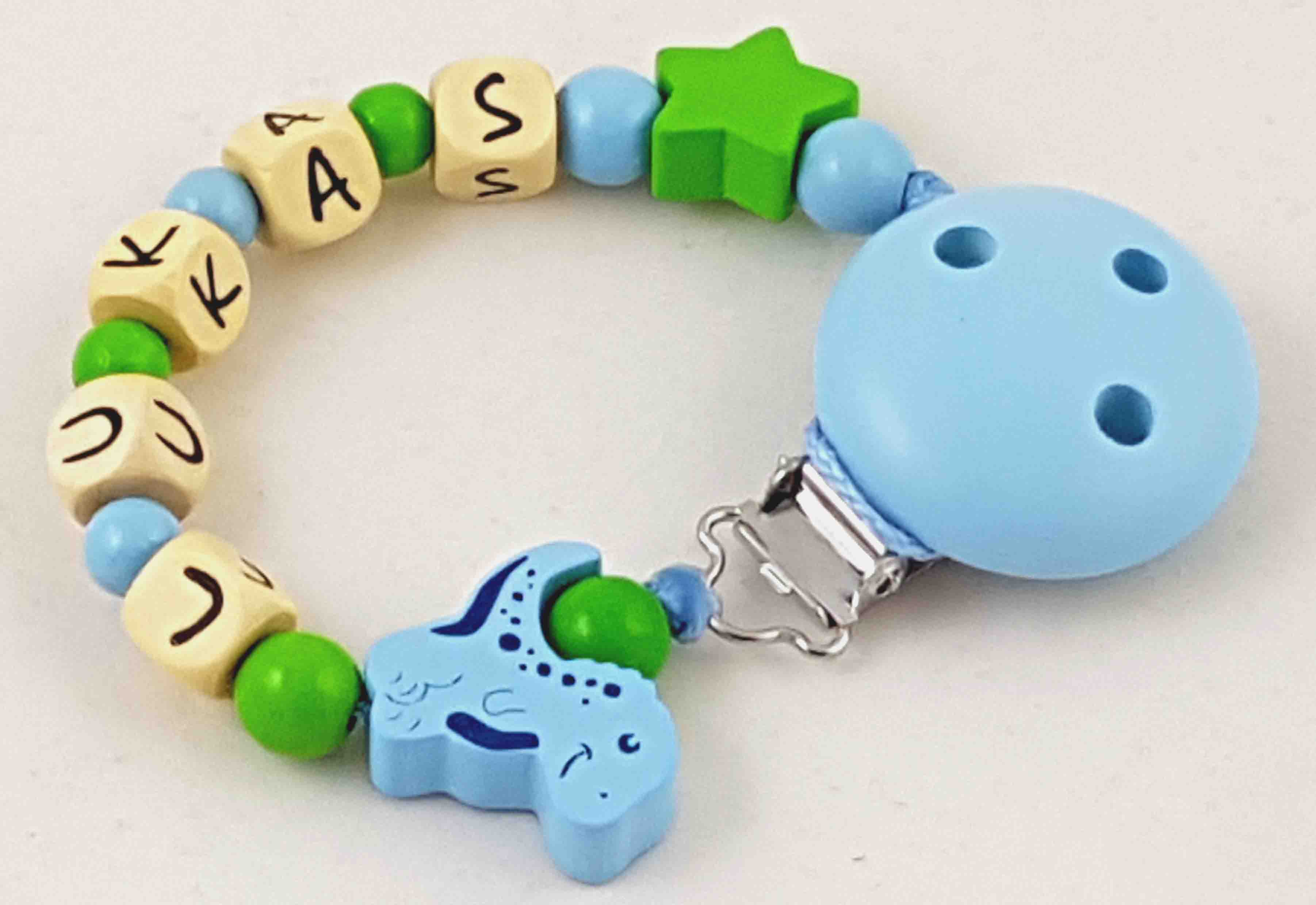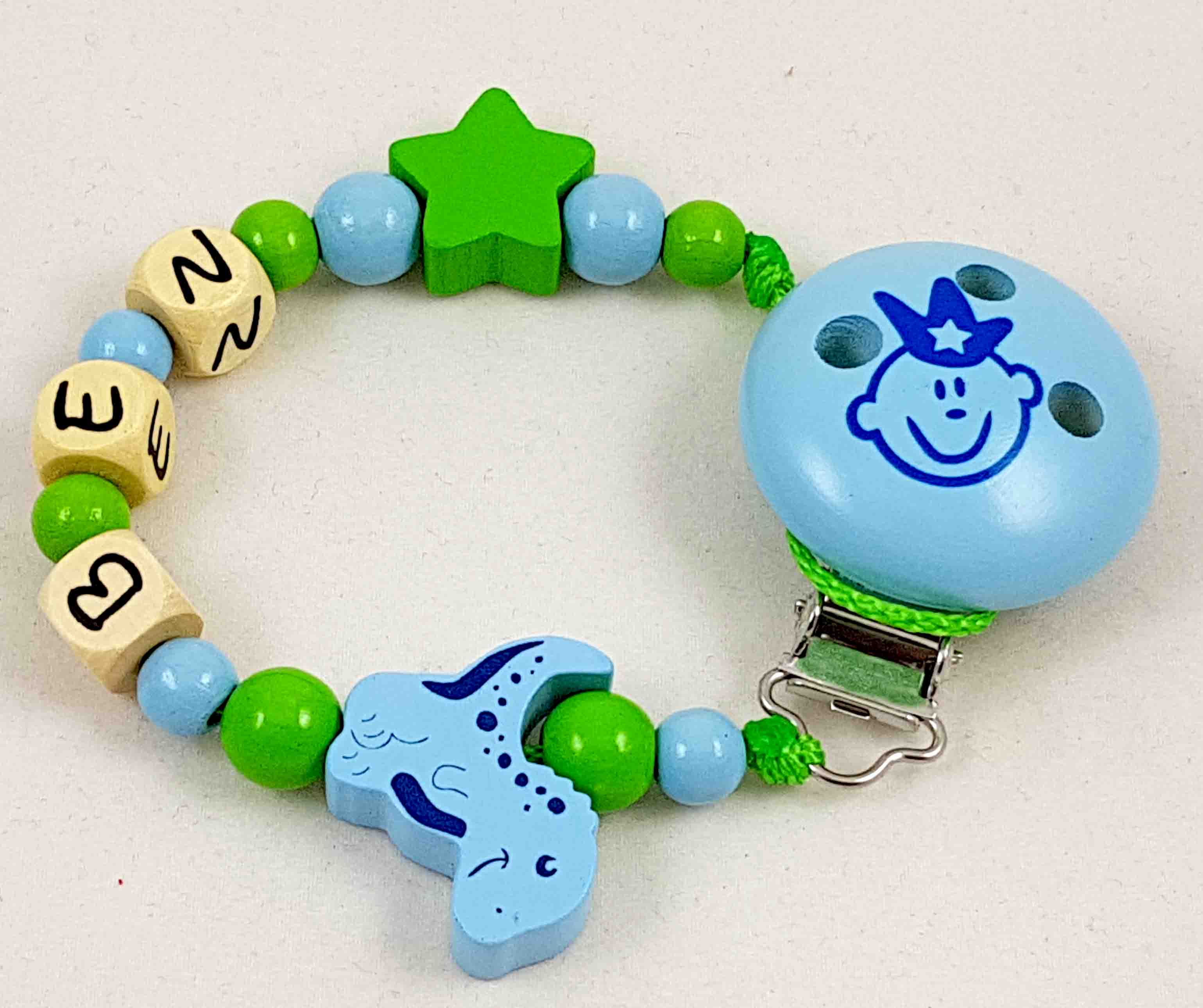 Dieses Schnullerketten-Modell wird in der Farbkombi apfelgrün/babyblau, einer Motivperle Dino, einer Motivperle Stern und einem unifarbenen Befestigungsclip gefertigt.