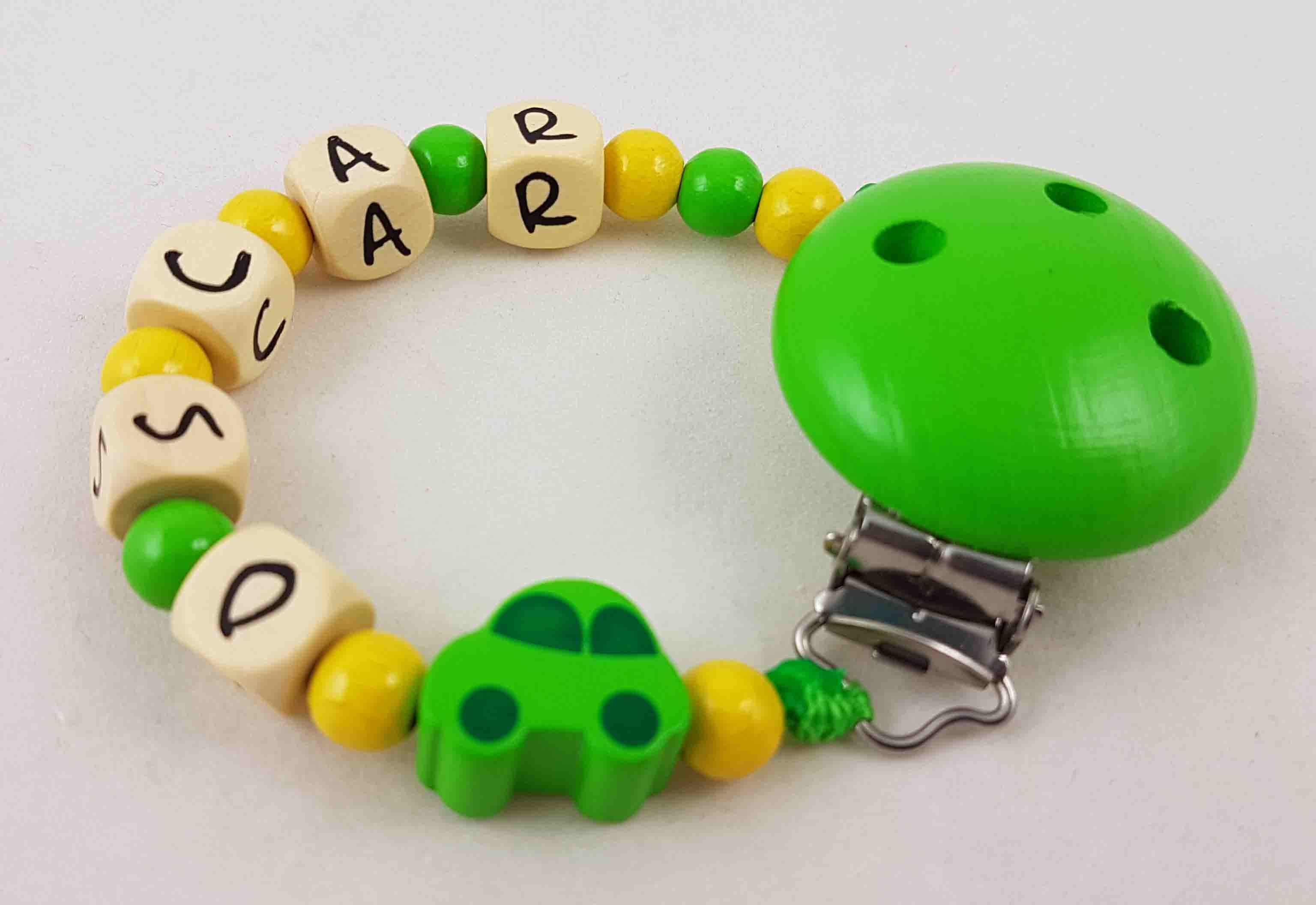 Schnullerkette mit Name "Auto" in apfelgrün/gelb