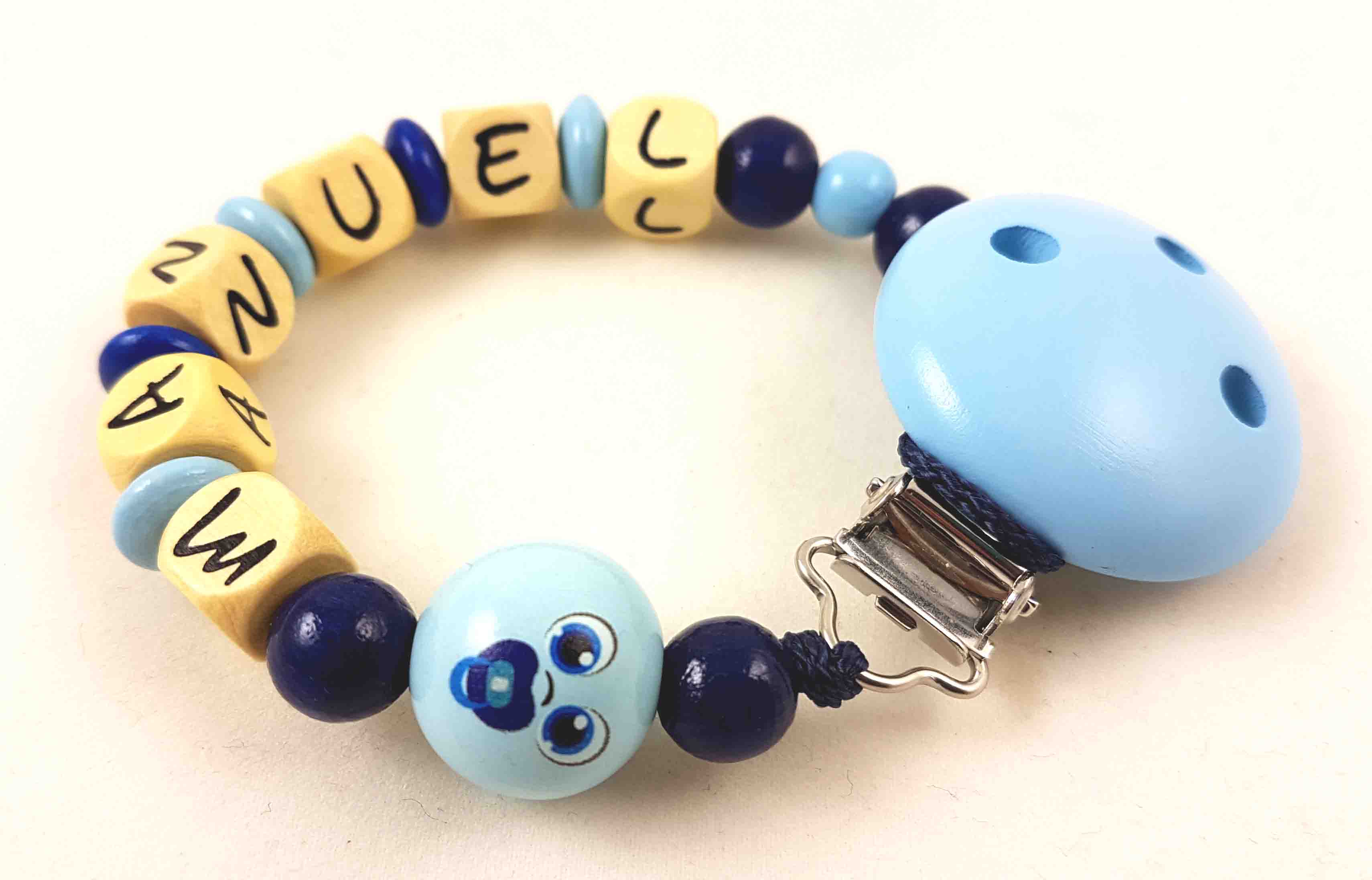 Schnullerkette mit Name "3D Baby" in babyblau/dunkelblau