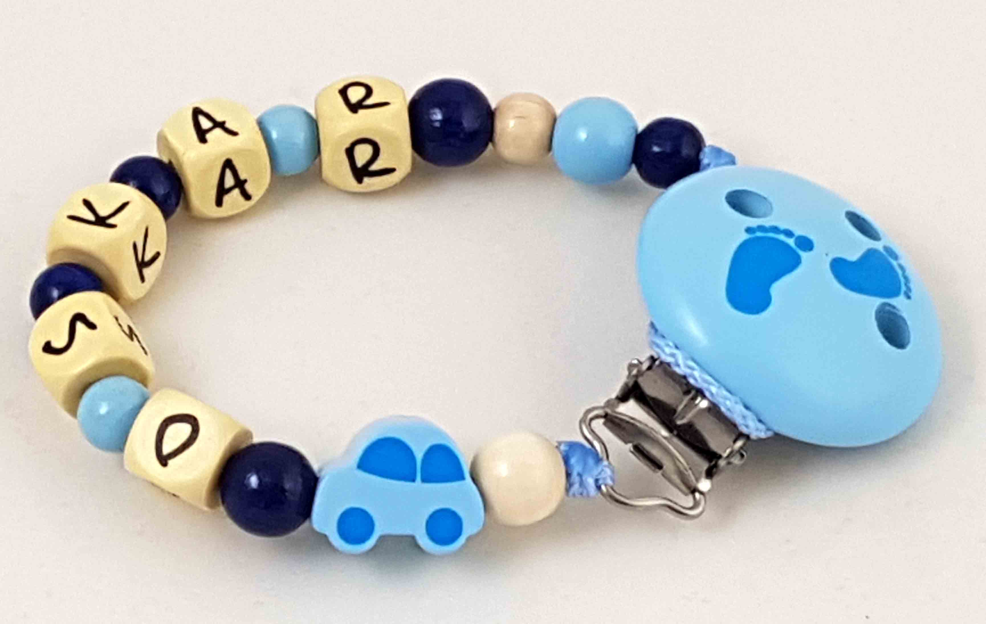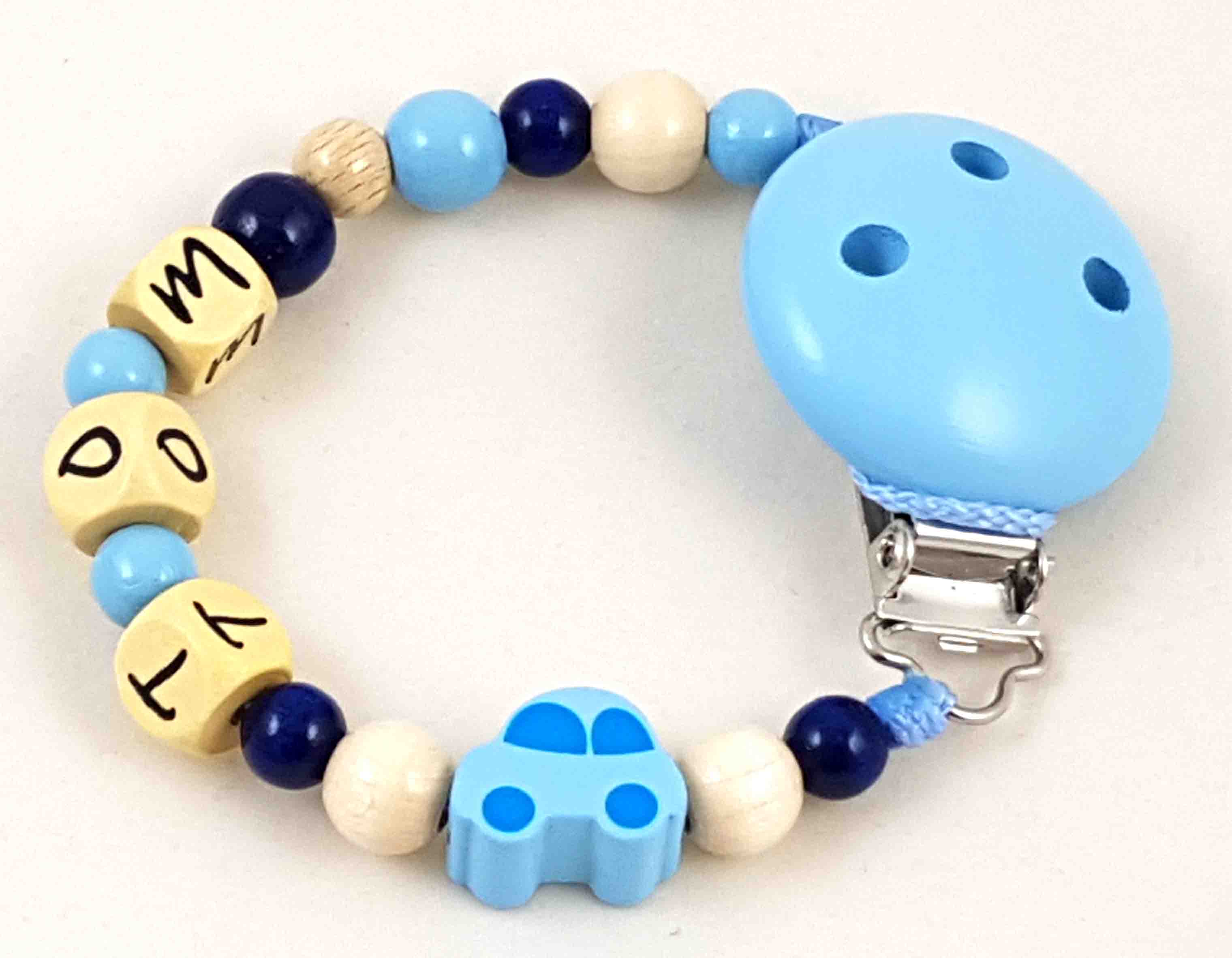 Schnullerkette mit Name "Auto" in babyblau/dunkelblau/natur
