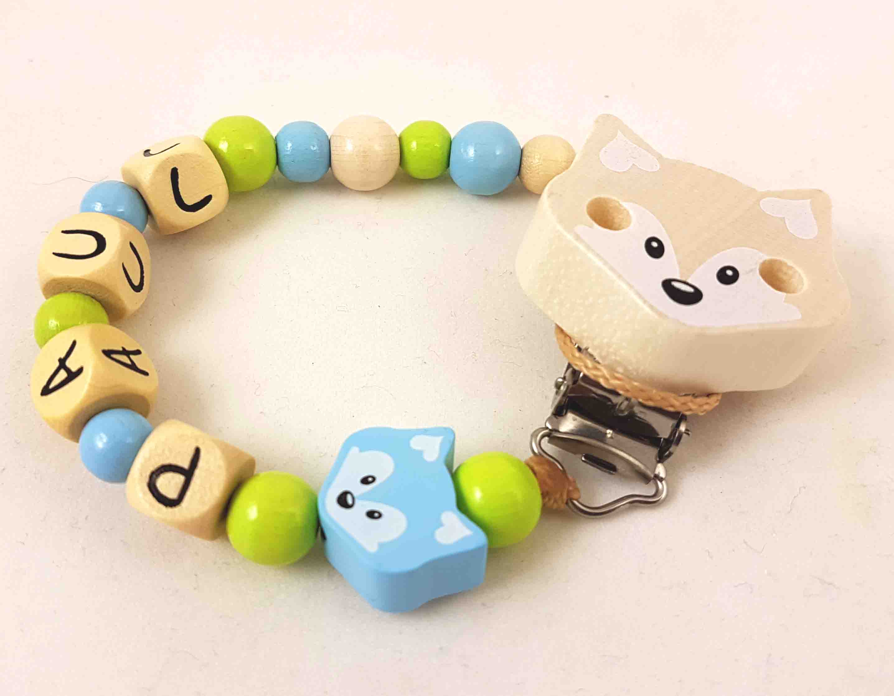 Dieses Schnullerketten-Modell wird in der Farbkombi babyblau/lemon/natur, einer Motivperle Fuchs und einem unifarbenen Befestigungsclip gefertigt.
