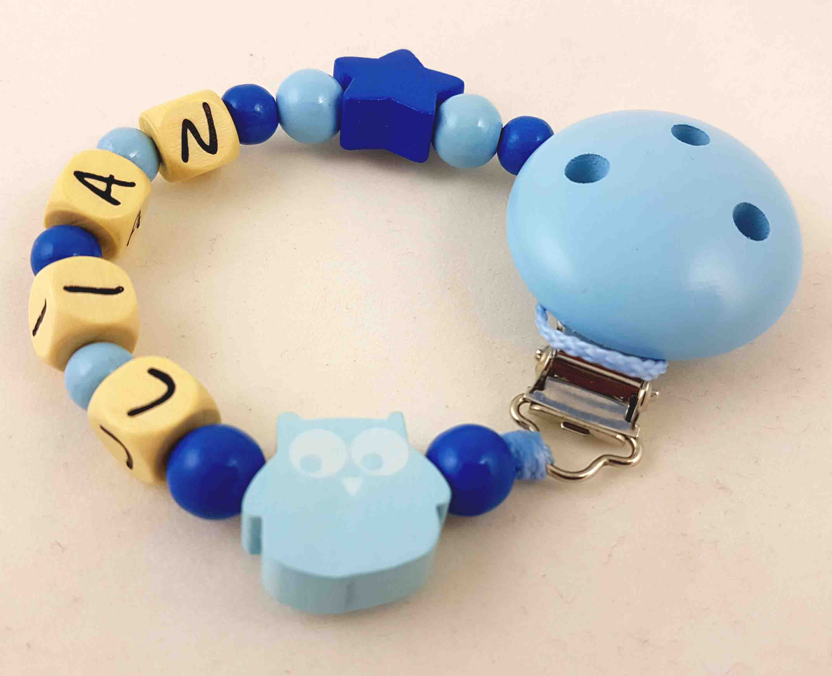 Dieses Modell wird in der Farbkombi babyblau/mittelblau, einer Motivperle Eule, einer Motivperle Stern und einem unifarbenen Befestigungsclip gefertigt.