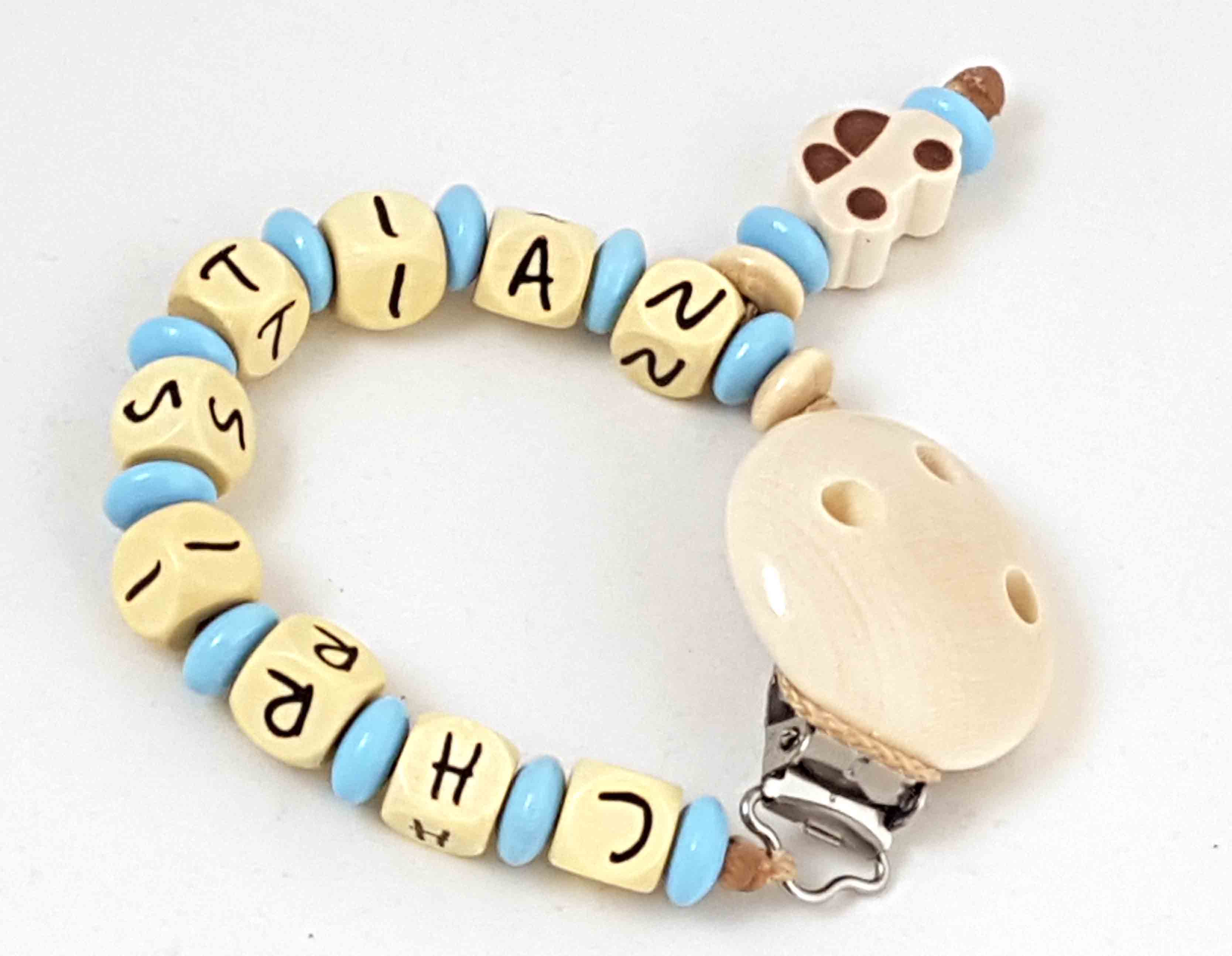 Die abgebildete Schnullerkette besteht aus einer belastbaren PP-Schnur, einem nickelfreien Befestigungsclip aus Holz, geprägten Holzbuchstabenwürfel und Holzperlen bzw. Holzlinsen sowie einer Motivperle aus Holz.