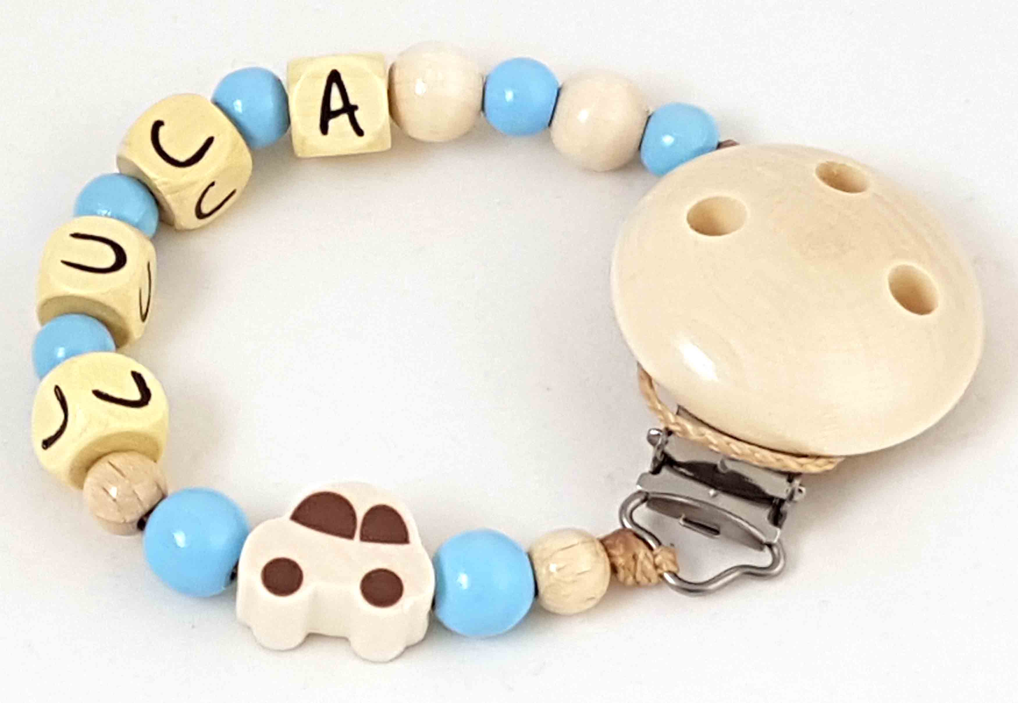 Dieses Schnullerkette-Modell wird in der Farbkombi babyblau/natur, einer Motivperle Auto und einem unifarbenen Befestigungsclip gefertigt.