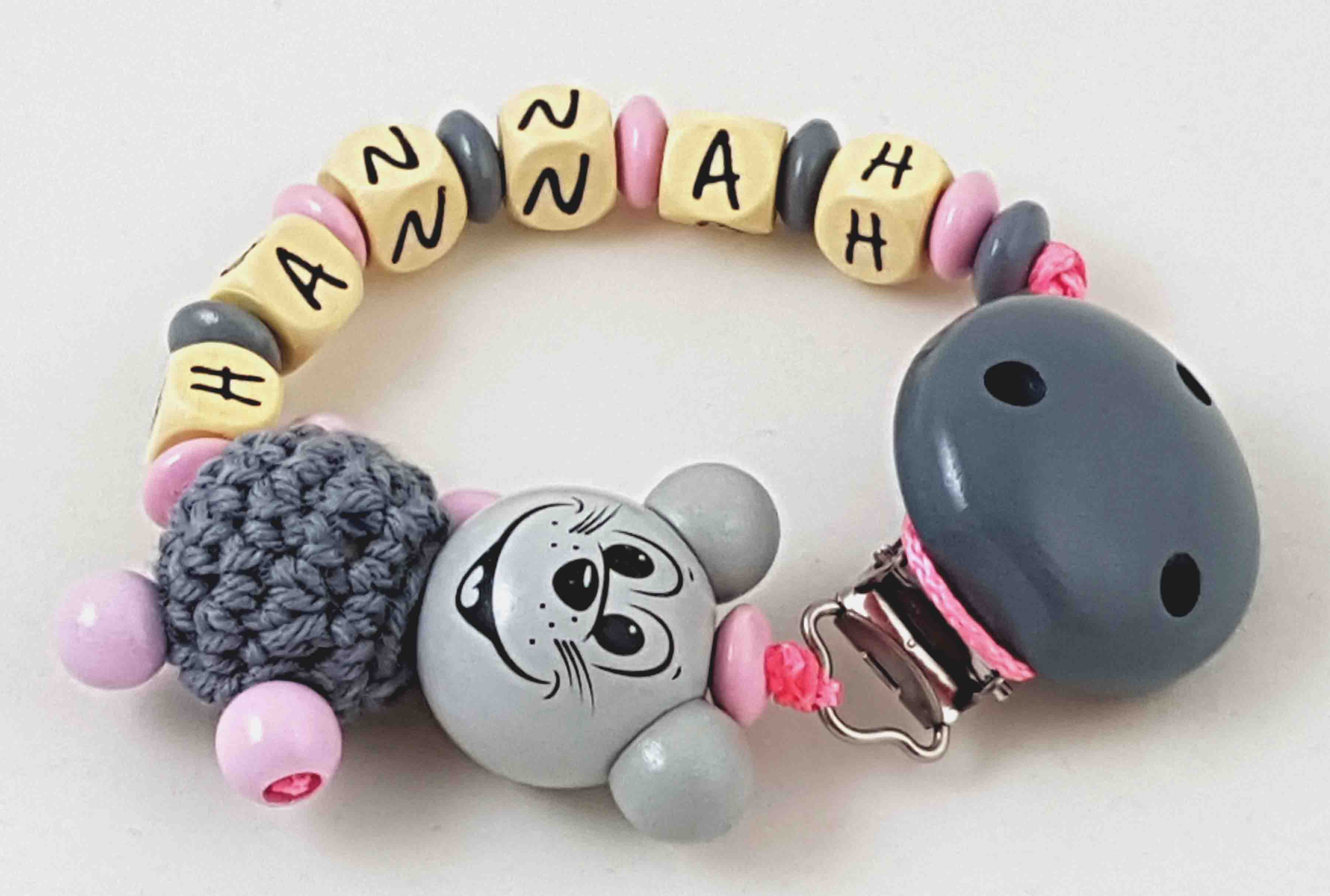 Dieses Modell wird in der Farbkombi babyrosa/grau, einer Motivperle 3D Maus&Häkelkörper und einem unifarbenen Befestigungsclip gefertigt.