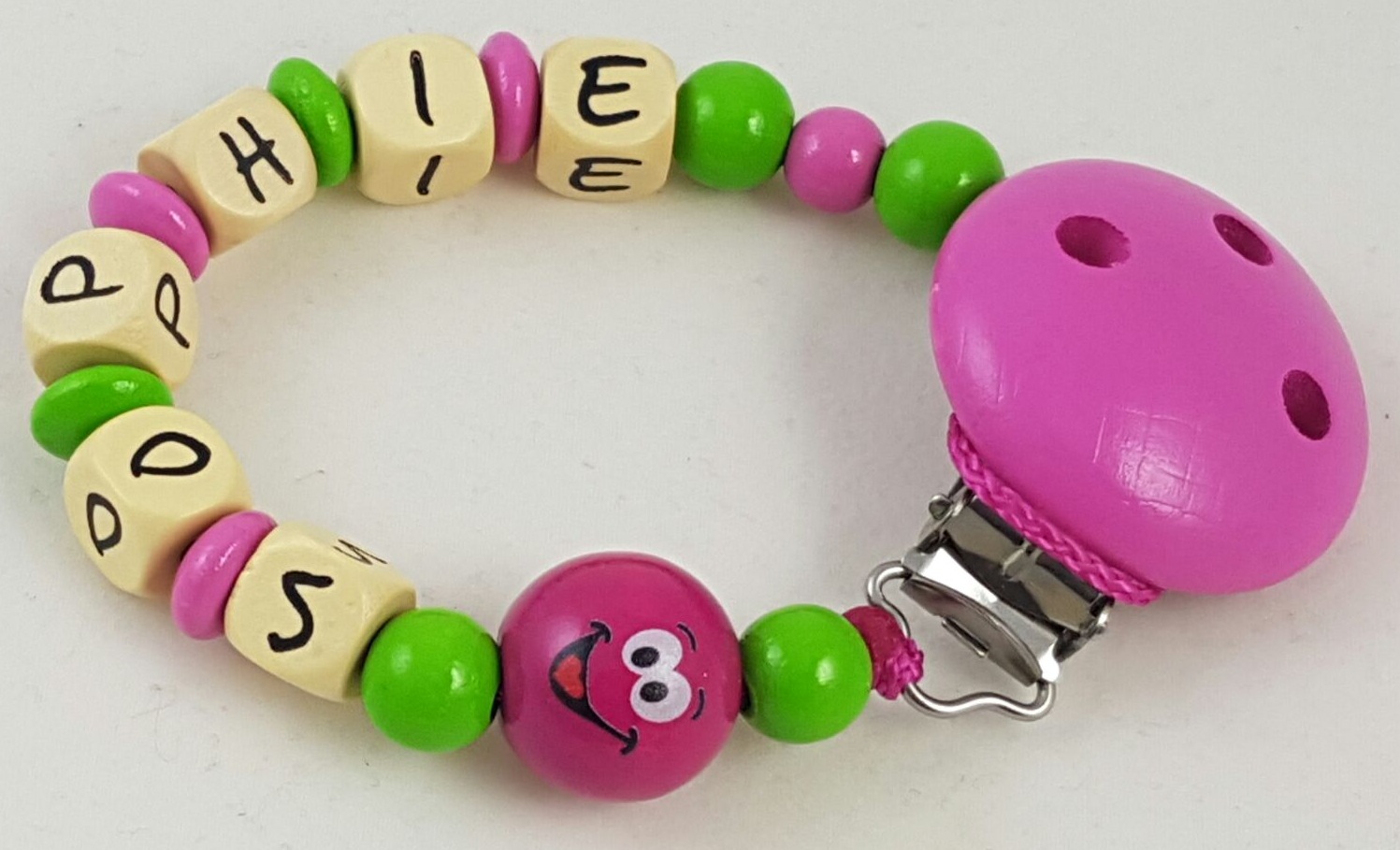 Dieses Schnullerketten-Modell wird in der Farbkombi pink/apfelgrün, einer Motivperle 3D Smiley und einem unifarbenen Befestigungsclip gefertigt.