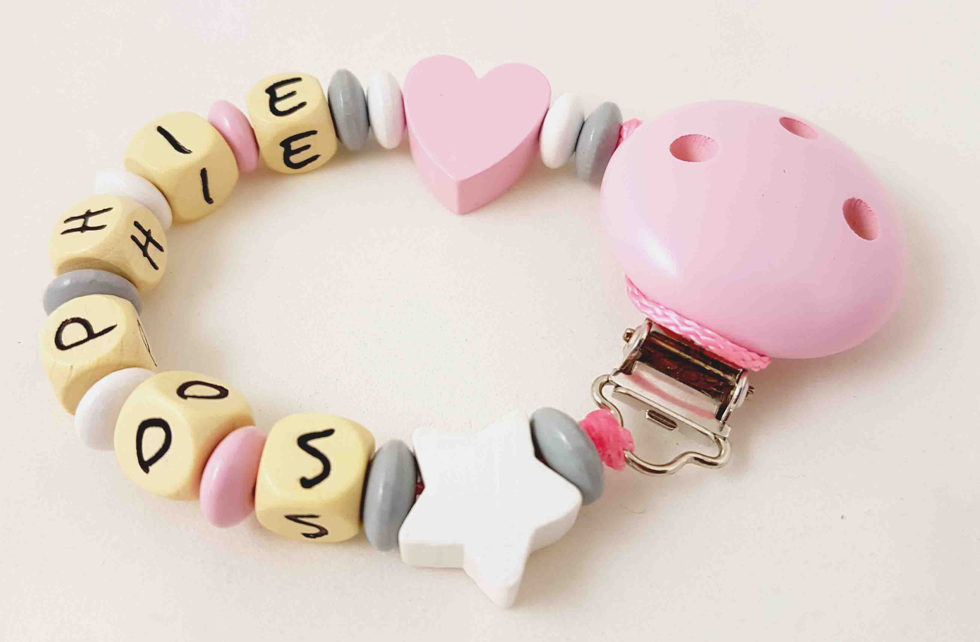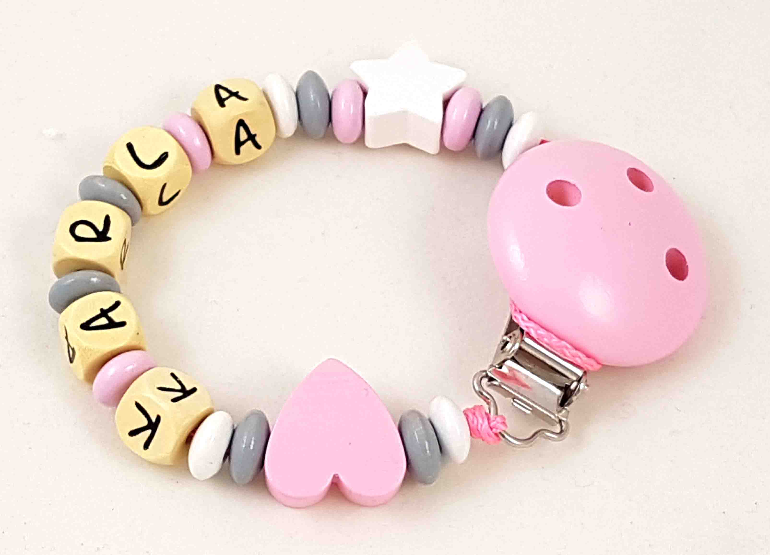 Dieses Modell wird in der Farbkombi babyrosa/grau/weiß, einer Motivperle Stern, einer Motivperle Herz und einem unifarbenen Befestigungsclip gefertigt.