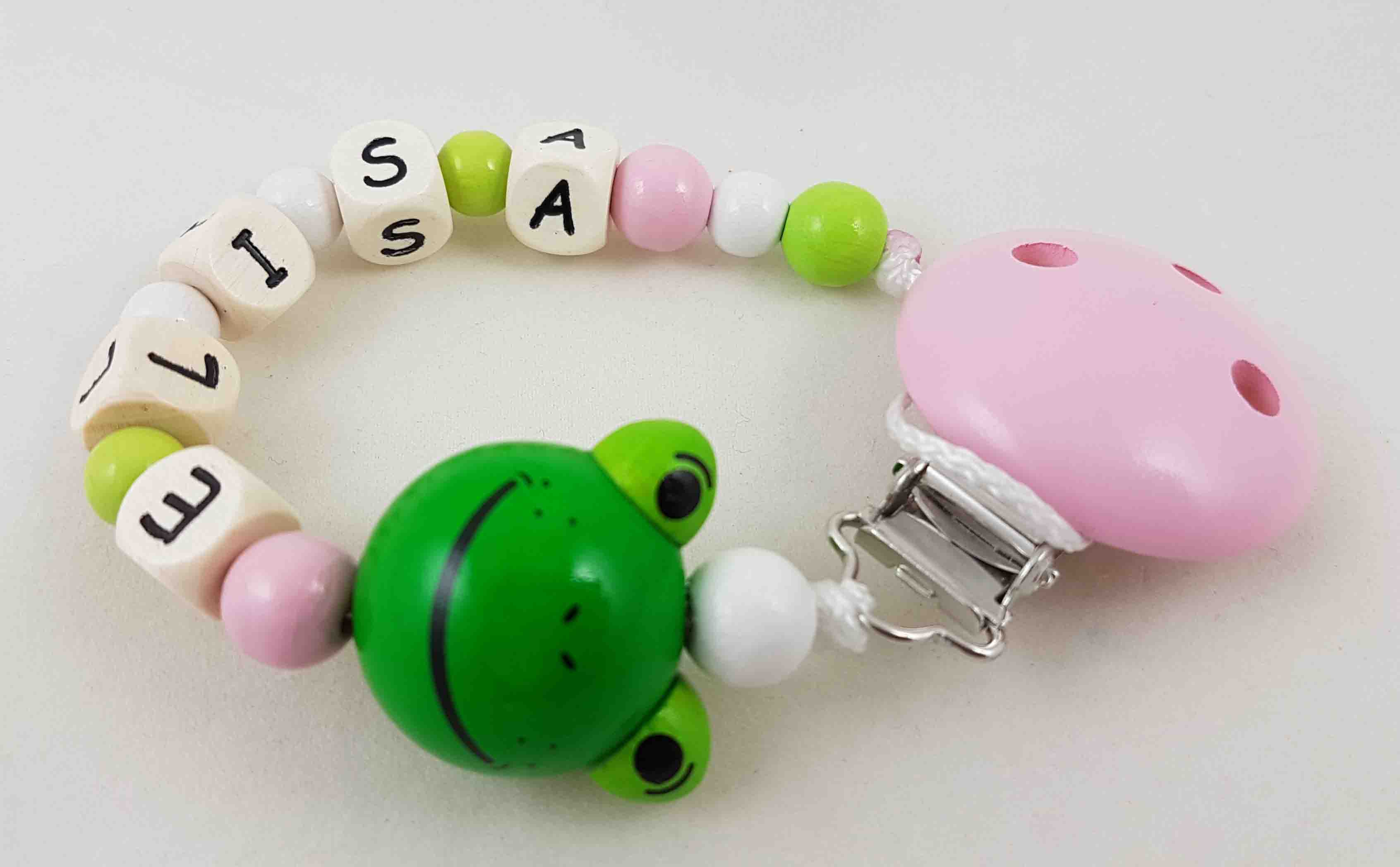 Schnullerkette mit Name "Frosch" in babyrosa/lemon/weiß
