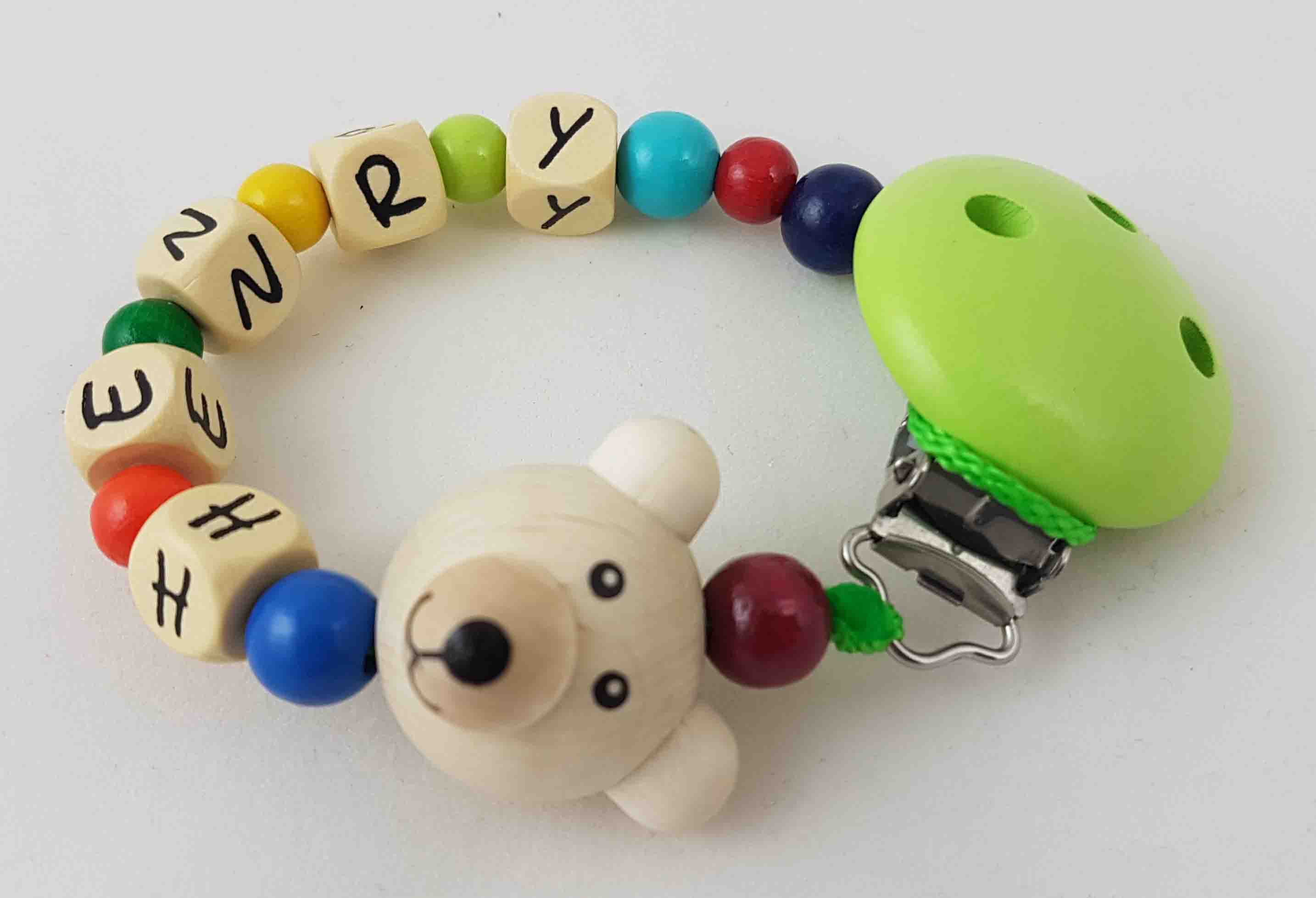 Dieses Modell wird in der bunten Farbkombi, einer Motivperle 3D Bär und einem unifarbenen Befestigungsclip gefertigt.