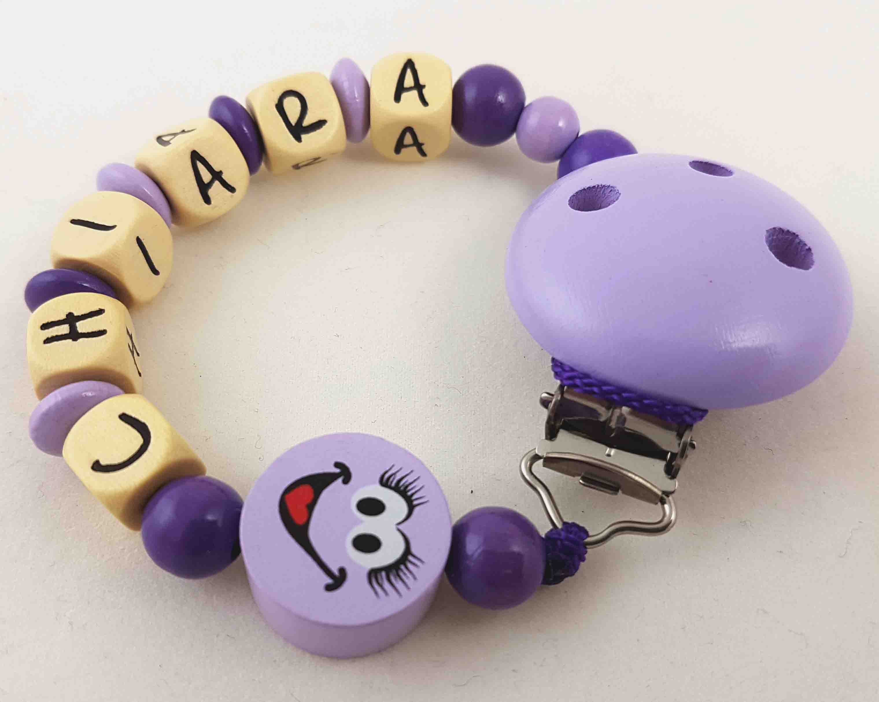 Dieses Schnullerketten-Modell wird in der Farbkombi flieder/lila, einer Motivperle Smiley und einem unifarbenen Befestigungsclip gefertigt.