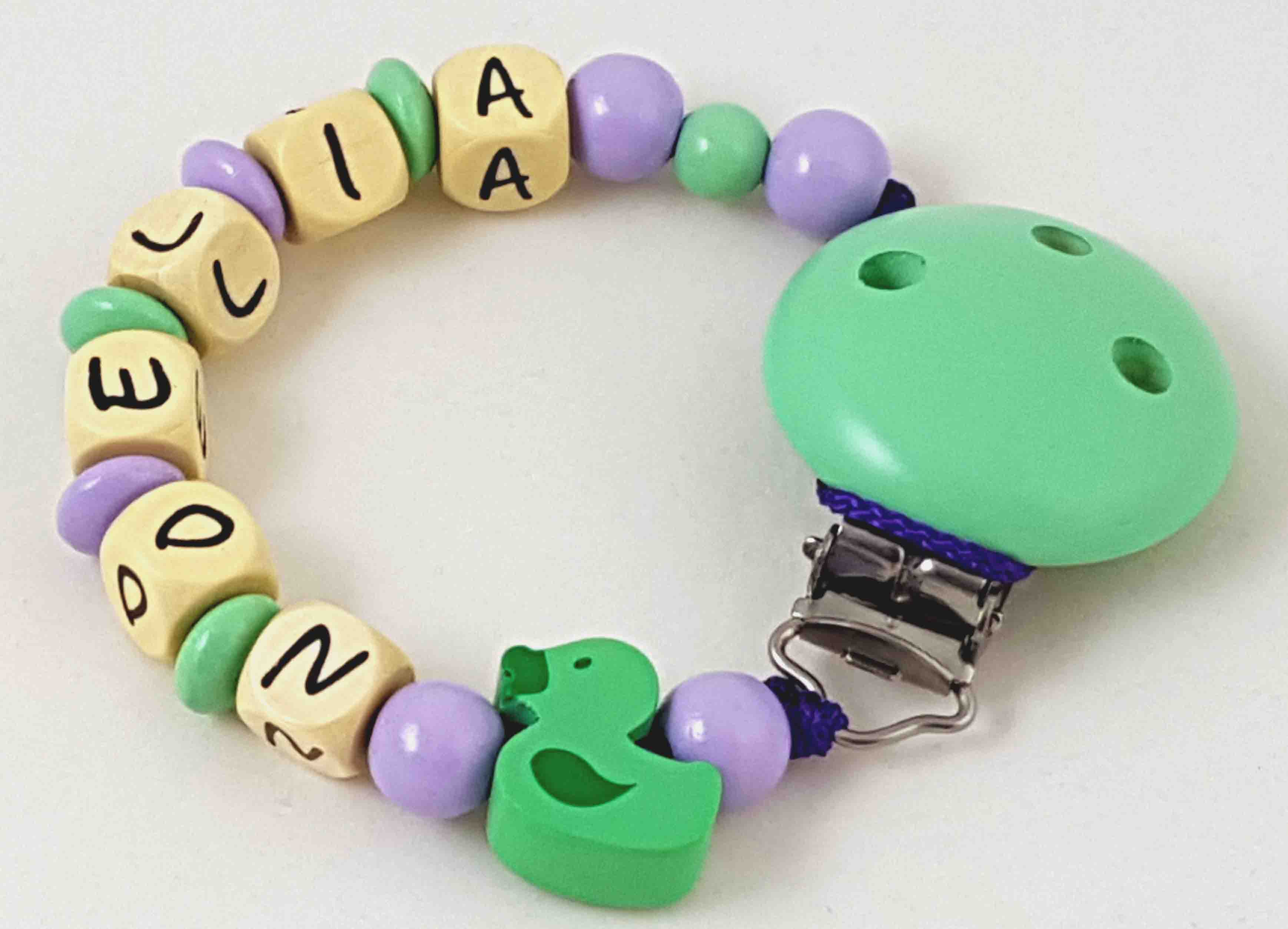 Schnullerkette mit Name "Ente" in flieder/pastellgrün