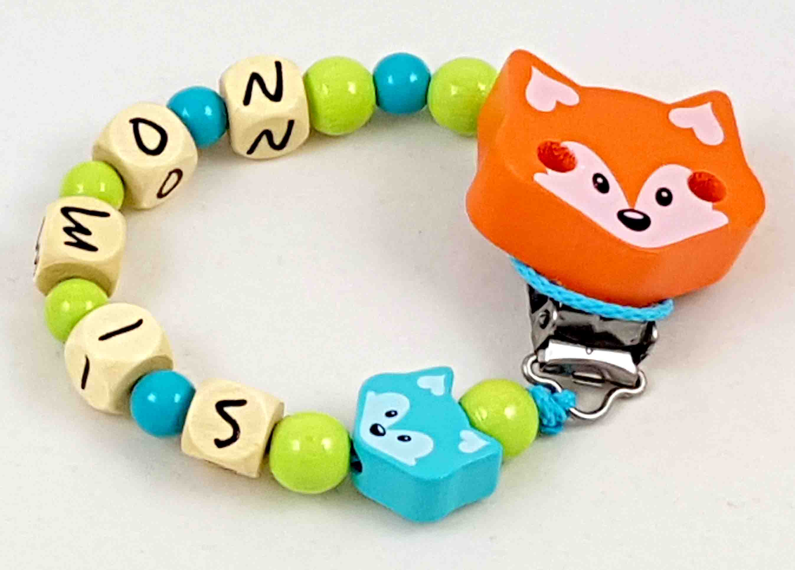 Dieses Modell wird in der Farbkombi lemon/mint, einer Motivperle Fuchs und einem unifarbenen Befestigungsclip gefertigt.