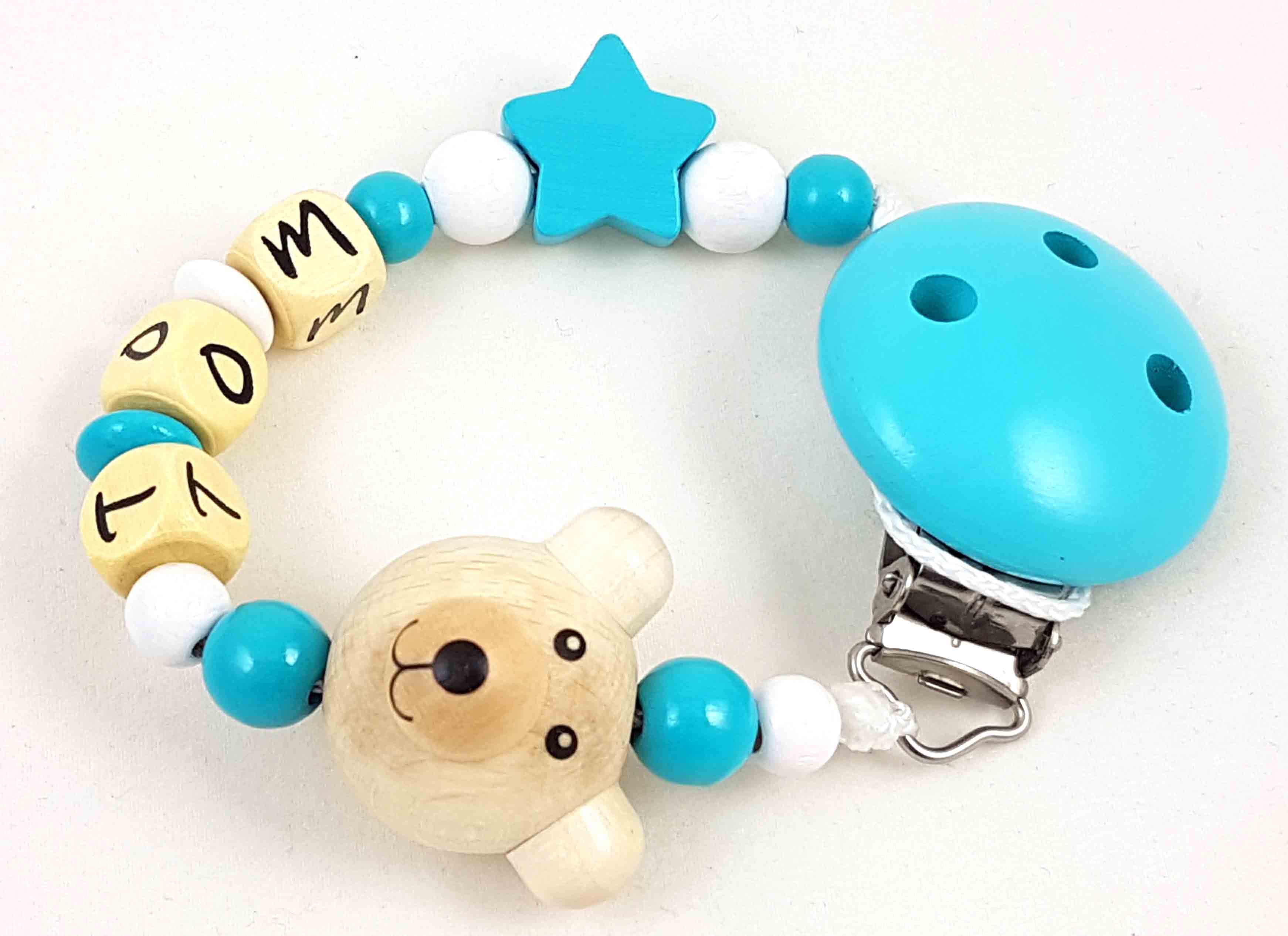 Schnullerkette mit Name "Bär&Stern" in mint/weiß