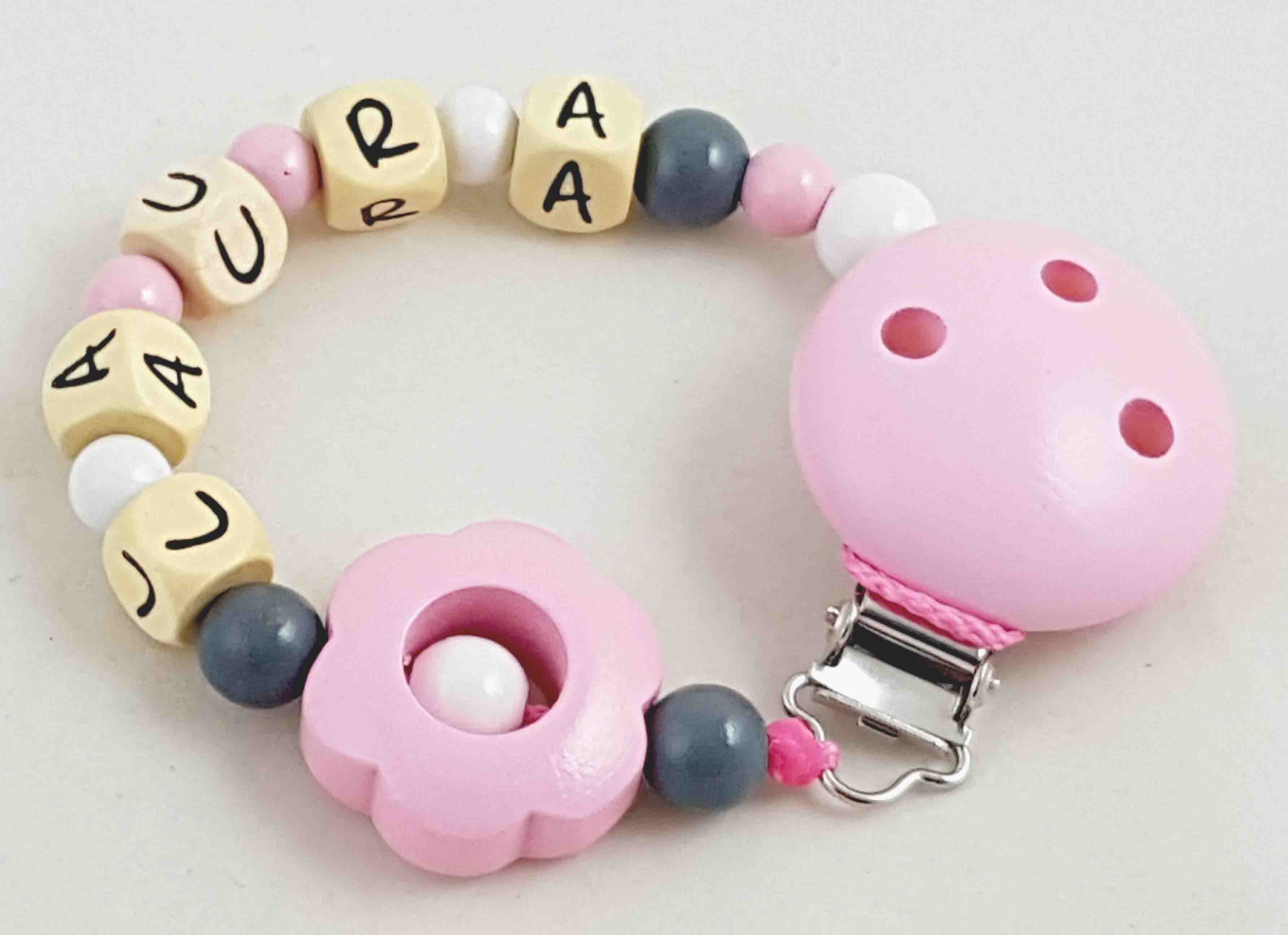 Schnullerkette mit Namen ist ein süßes Geschenk zur Geburt, Taufe oder einfach nur als Mitbringsel.