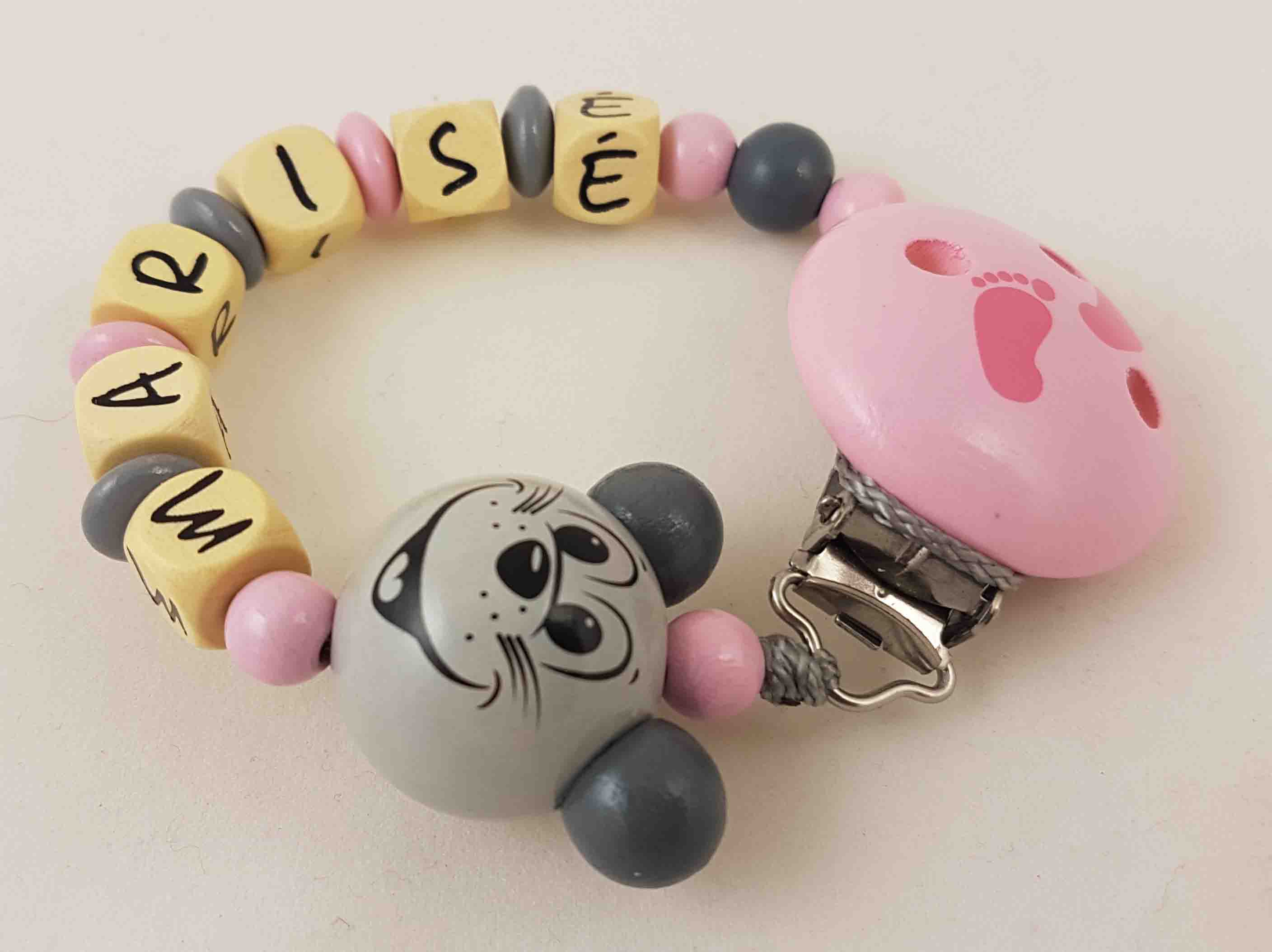 Dieses Modell wird in der Farbkombi babyrosa/grau, einer Motivperle 3D Maus und einem unifarbenen Befestigungsclip gefertigt.
