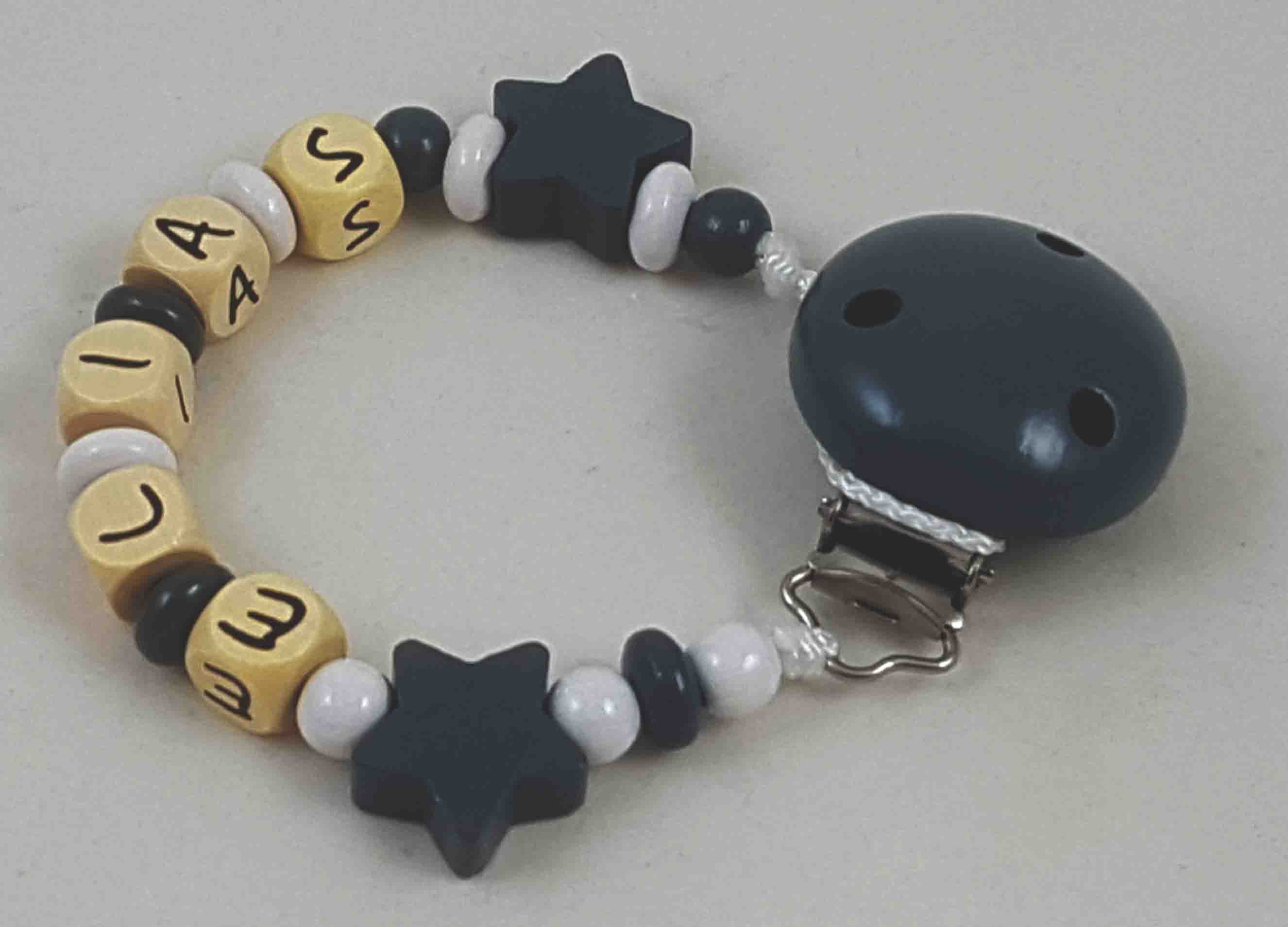 Dieses Modell wird in der Farbkombi grau/weiß, zwei Motivperlen Stern und einem unifarbenen Befestigungsclip gefertigt.