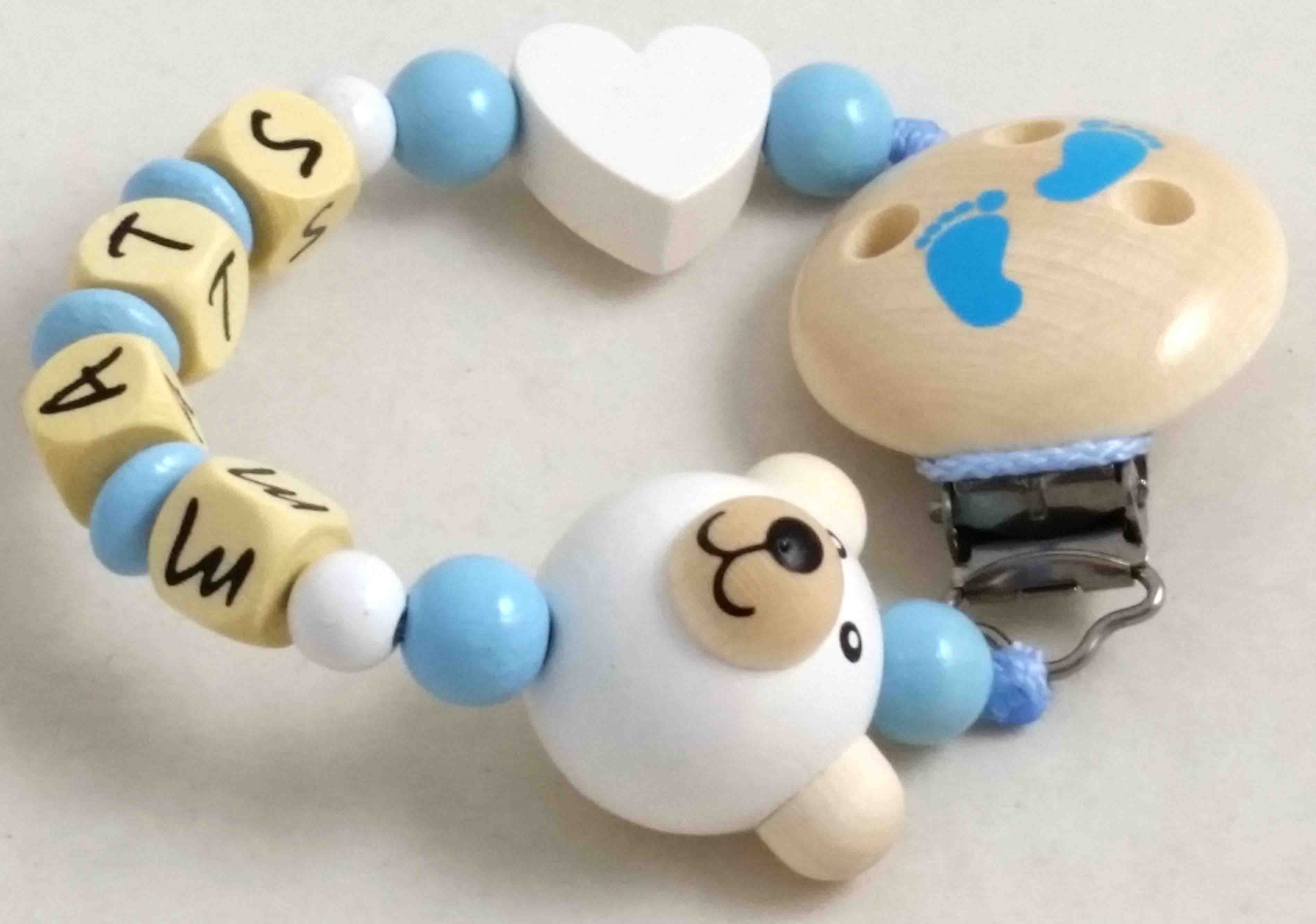 Die abgebildete Schnullerkette besteht aus einer belastbaren PP-Schnur, einem nickelfreien Befestigungsclip aus Holz, geprägten Holzbuchstabenwürfel und Holzperlen bzw. Holzlinsen sowie einer Motivperle aus Holz.