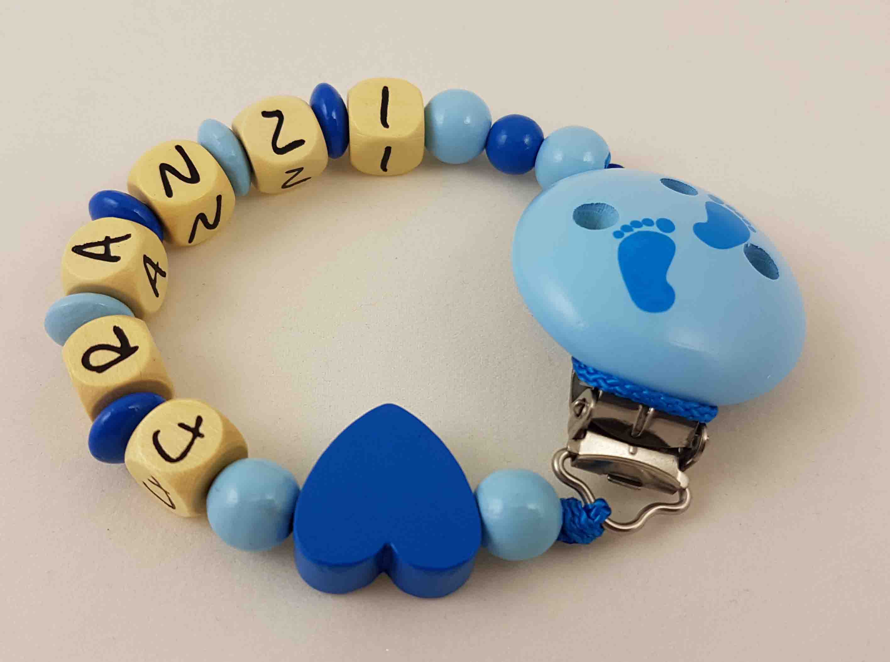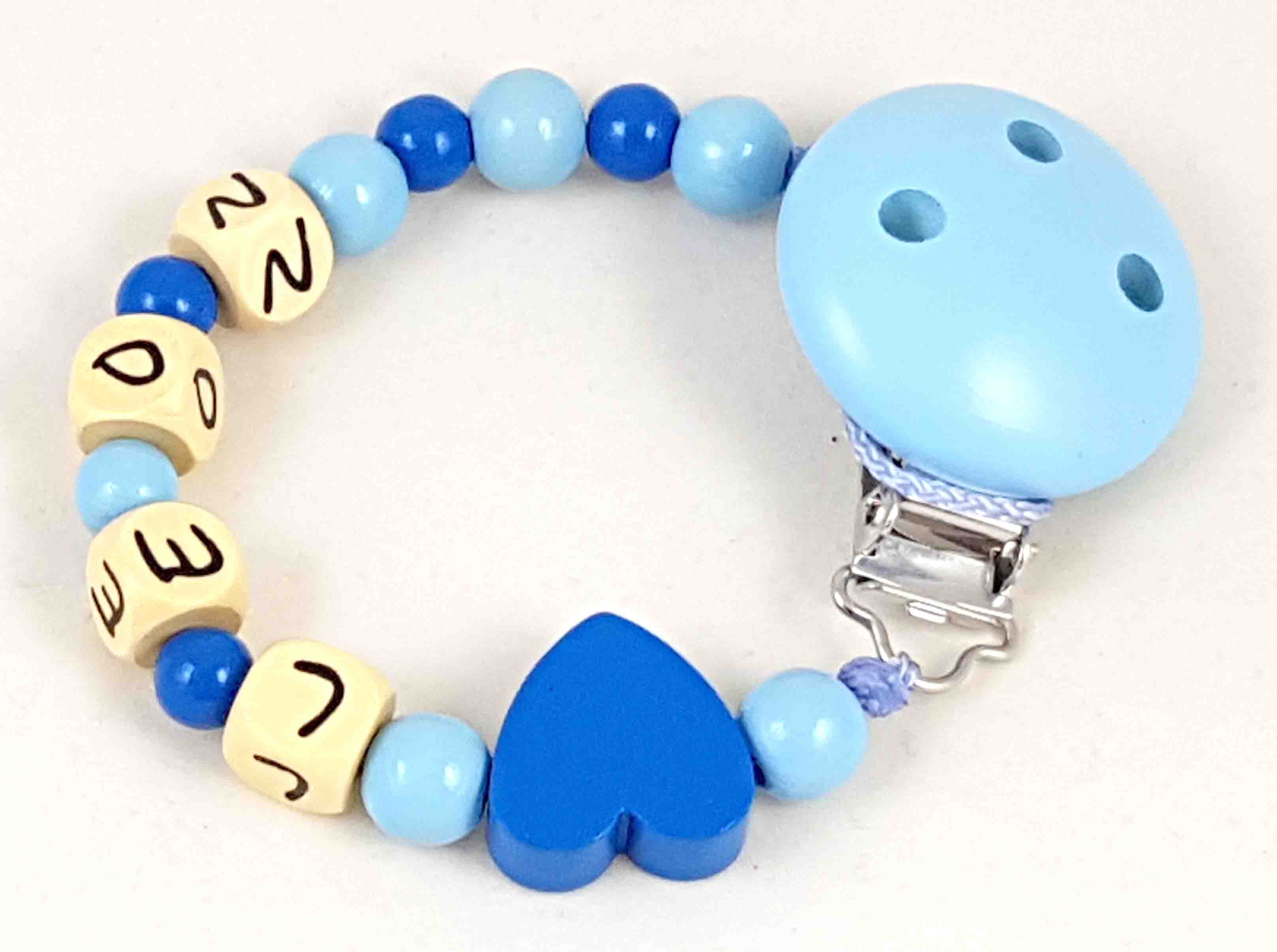 Dieses Schnullerkette-Modell wird in der Farbkombi mitteblau/babyblau, einer Motivperle Herz und einem unifarbenen Befestigungsclip gefertigt.