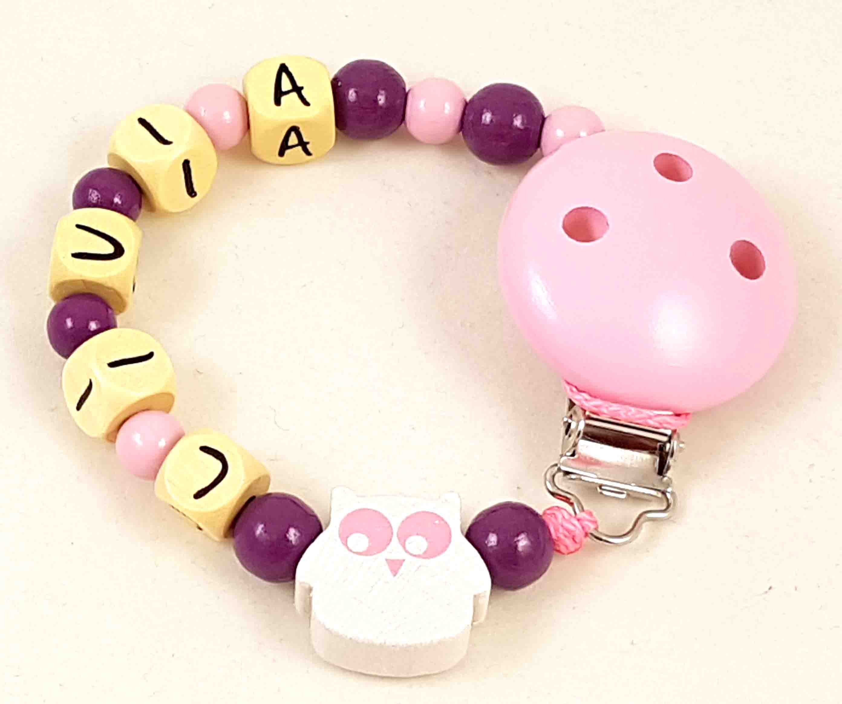 Schnullerkette mit Name "Eule" in babyrosa/pflaume