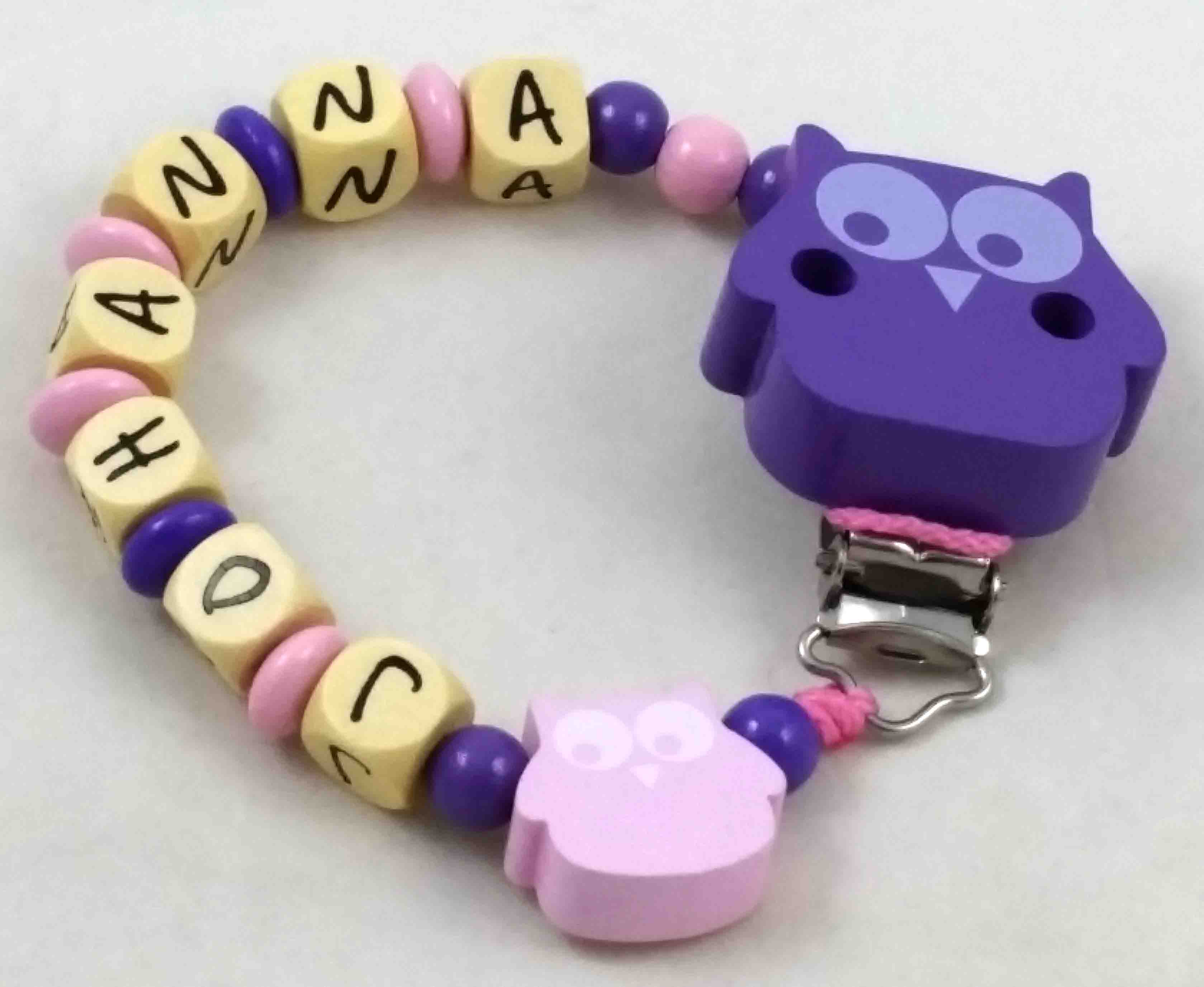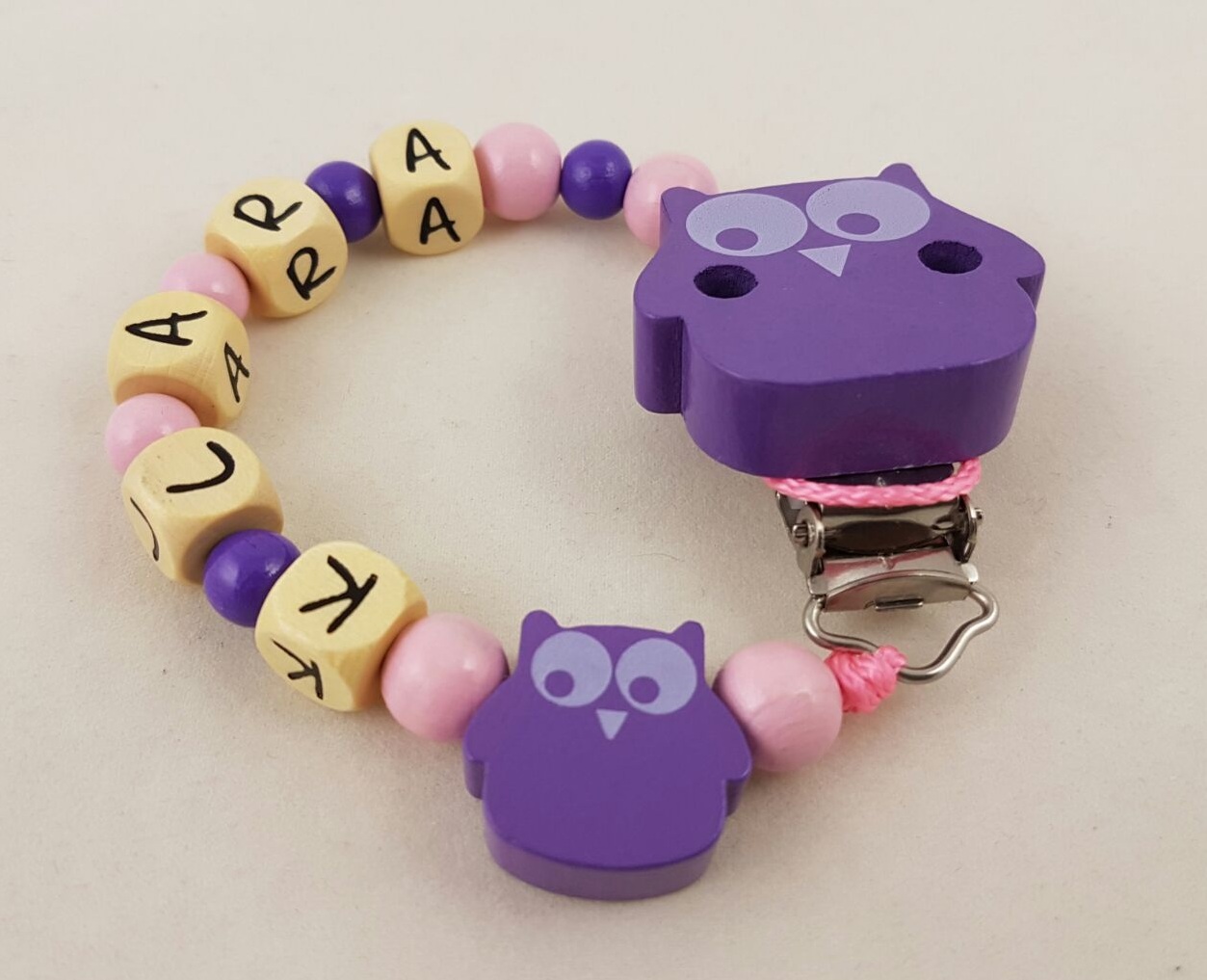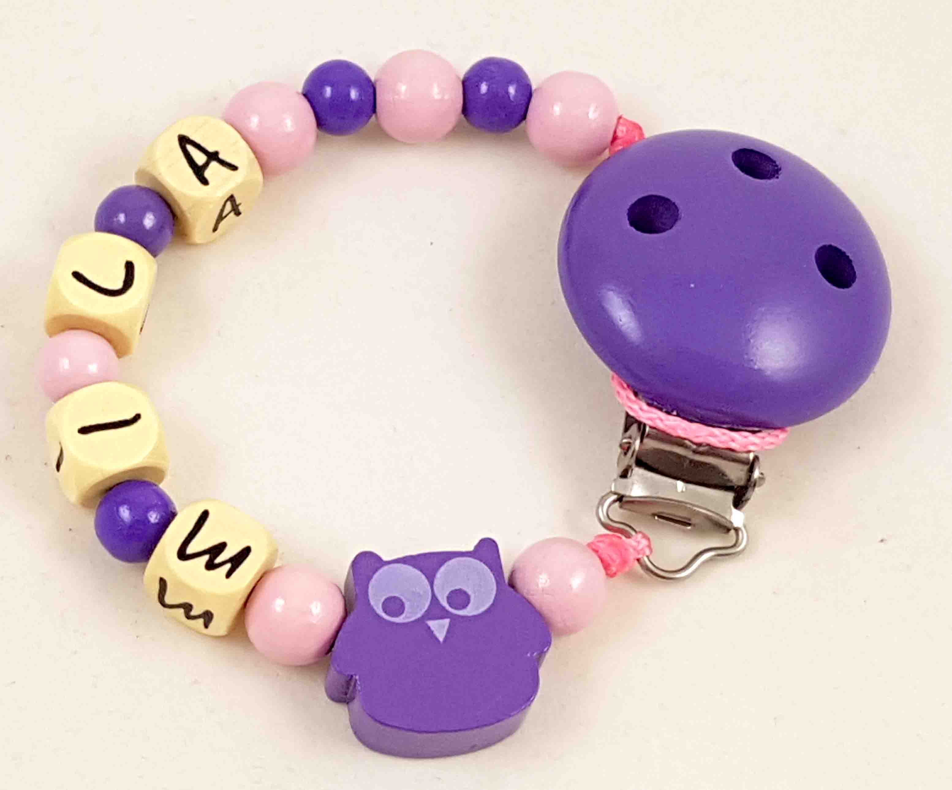 Schnullerkette mit Name "Eule" in babyrosa/lila