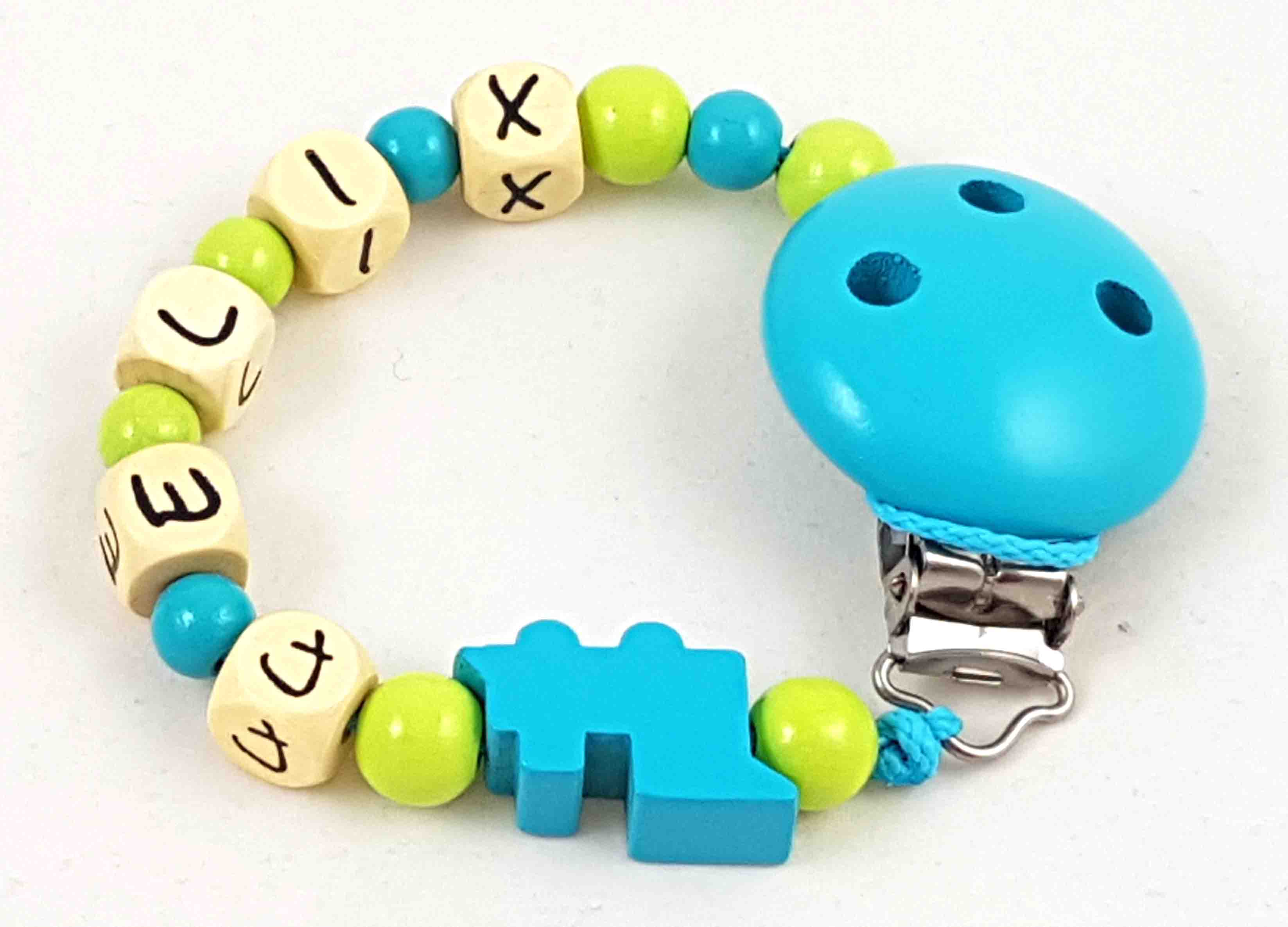 Die abgebildete Schnullerkette besteht aus einer belastbaren PP-Schnur, einem nickelfreien Befestigungsclip aus Holz, geprägten Holzbuchstabenwürfel und Holzperlen bzw. Holzlinsen sowie einer Motivperle aus Holz.