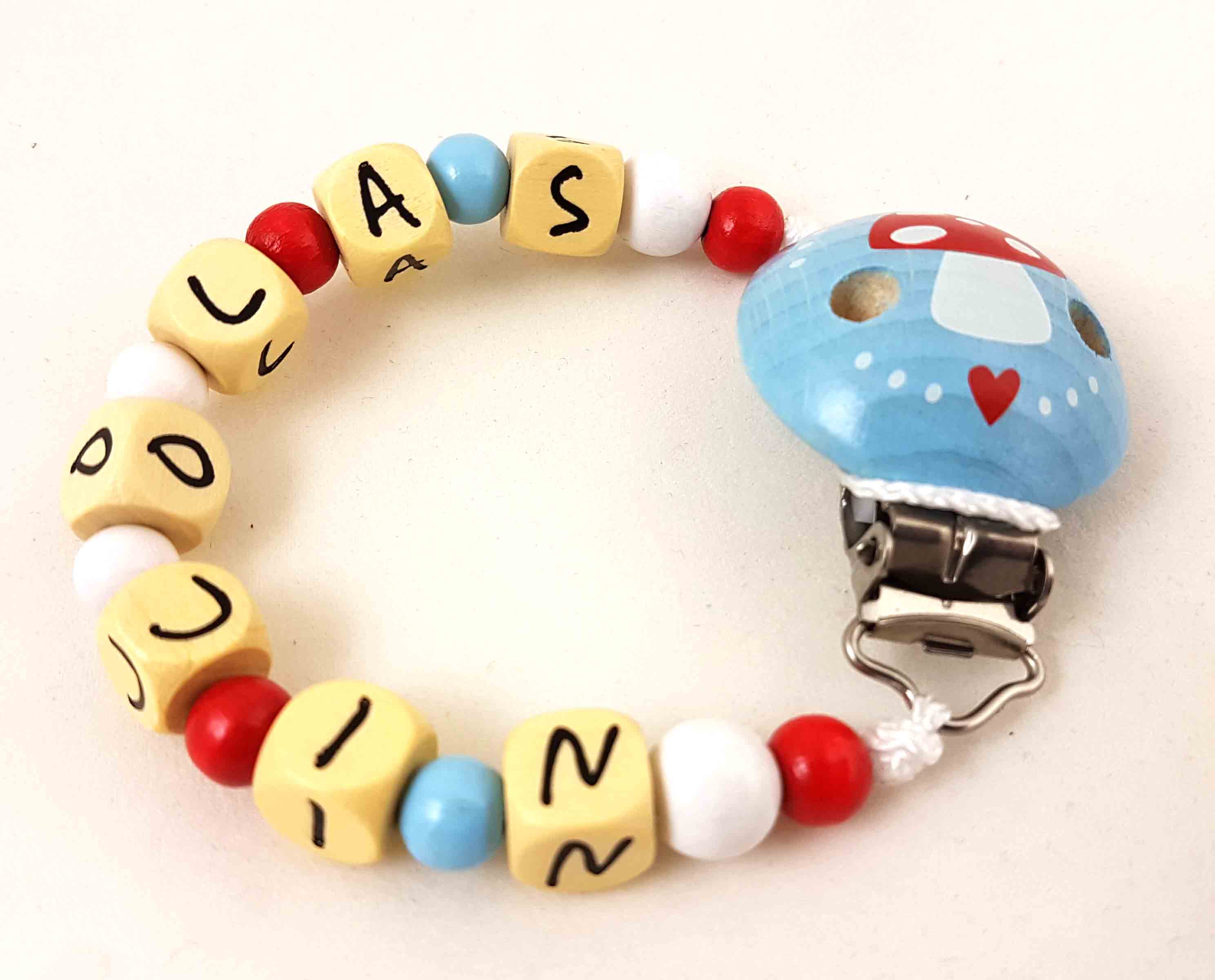Schnullerkette mit Name in babyblau/rot/weiß und Motivclip Pilz