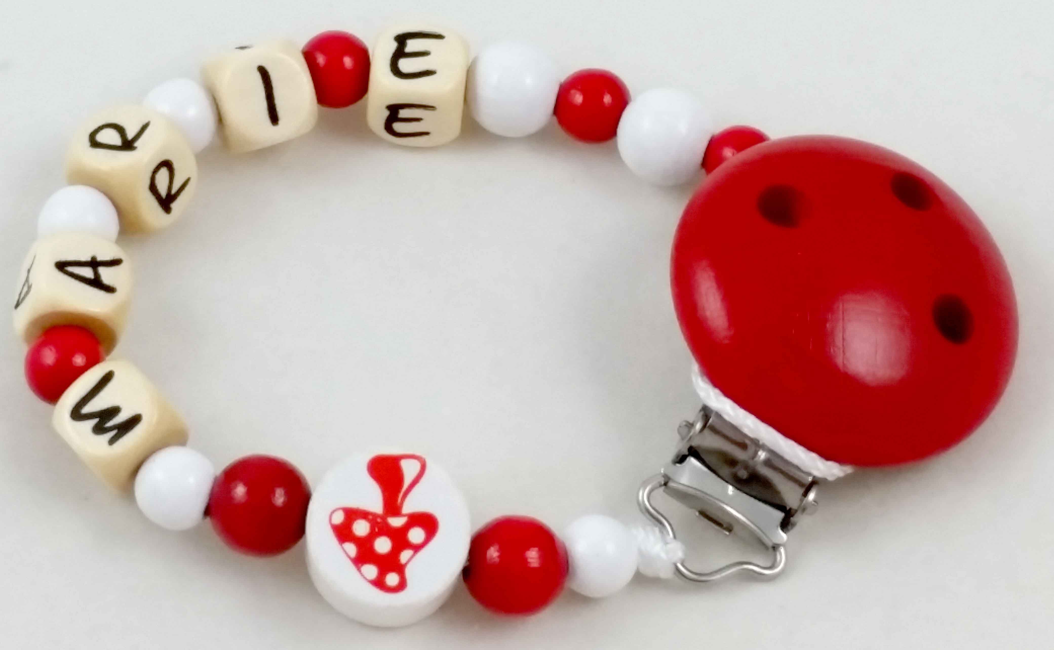 Dieses Schnullerketten-Modell wird in der Farbkombi weiß/rot, einer Motivperle Scheibchen Pilz und einem unifarbenen Befestigungsclip gefertigt.