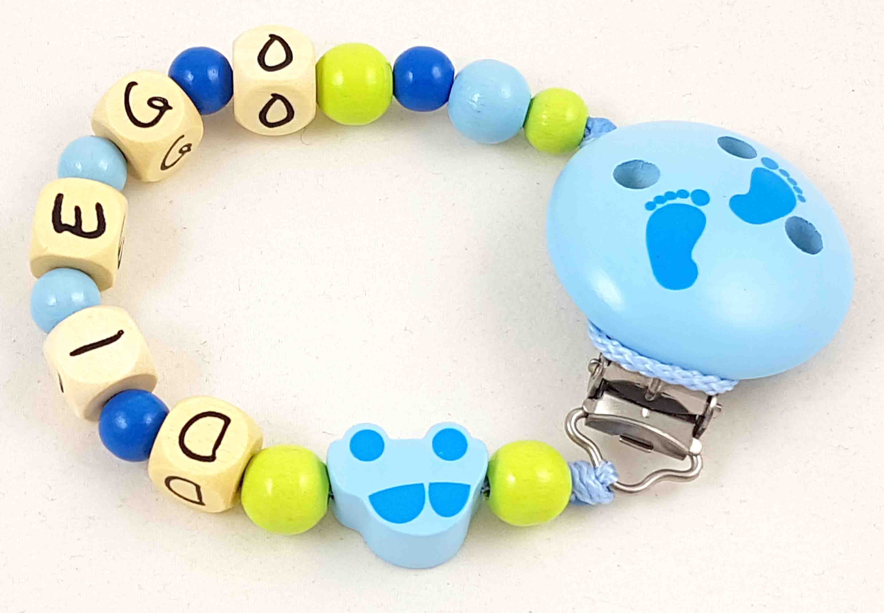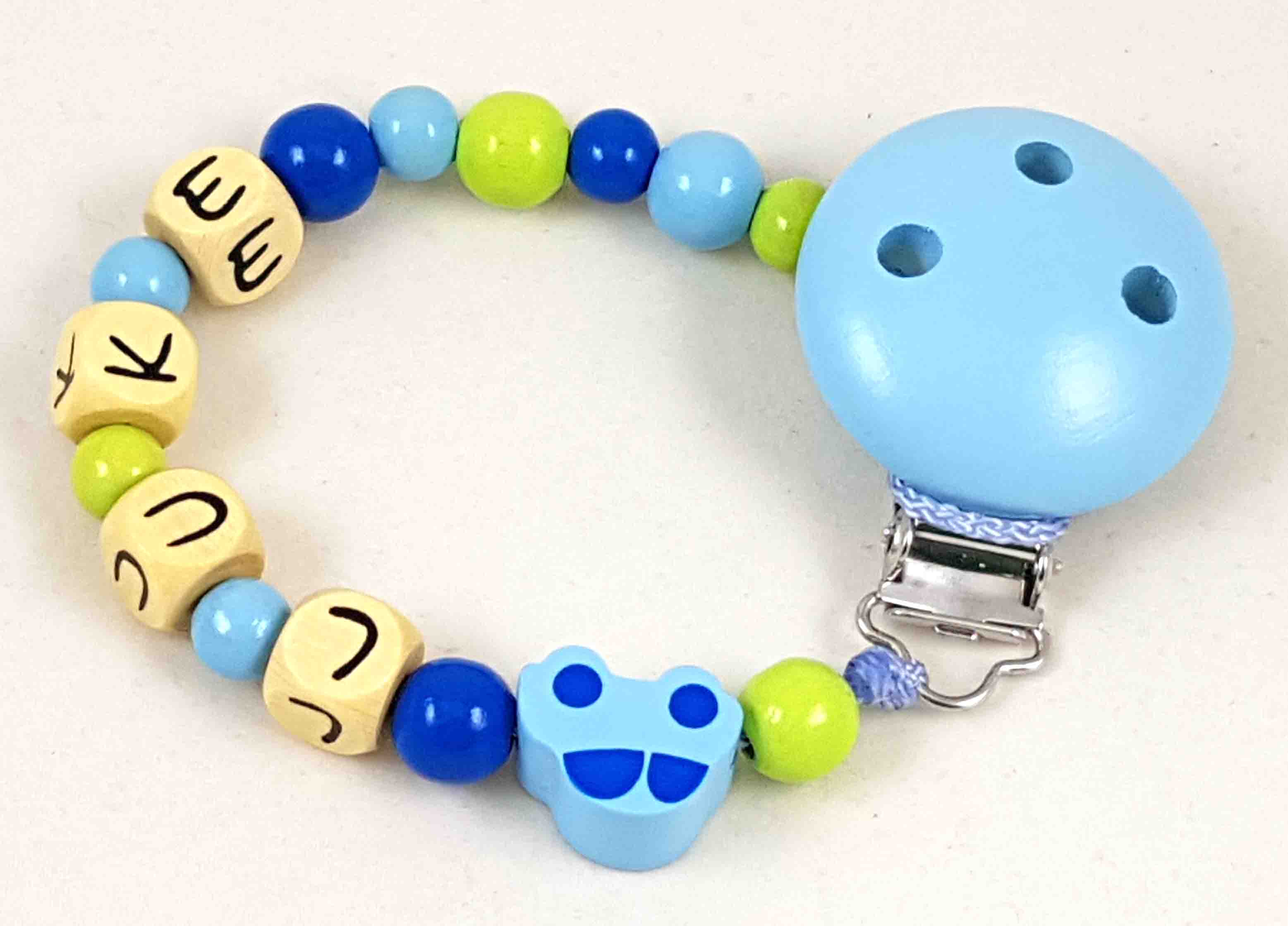Die abgebildete Schnullerkette besteht aus einer belastbaren PP-Schnur, einem nickelfreien Befestigungsclip aus Holz, geprägten Holzbuchstabenwürfel und Holzperlen bzw. Holzlinsen sowie einer Motivperle aus Holz.